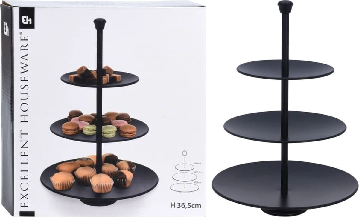 De etagere beschikt over 3 verdiepingen met een diameter van 16cm, 20.5cm en 25cm.