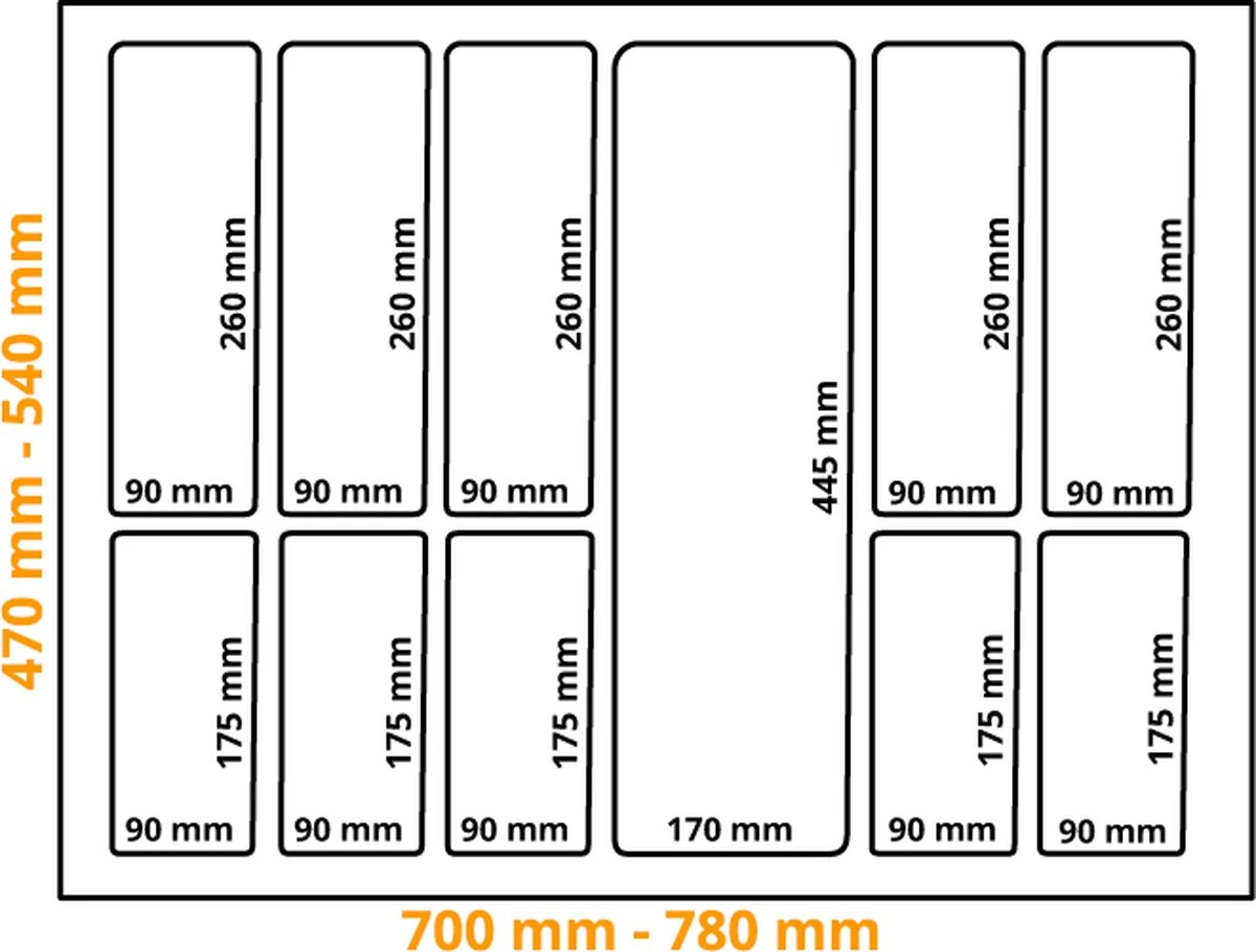 Deze bestekbak heeft een maximale diepte van 54 cm en is in te korten tot 47cm. Dit kunt u eenvoudig doen met behulp van een mesje. U hoeft alleen de bestekbak een aantal keer in te snijden. Hierna kunt het kunststof afbreken. Ook de breedte van onze bestekbakken is aanpasbaar. In dit geval is de maximale breedte van deze bestekbak 78 cm en de minimale breedte is 70 cm.