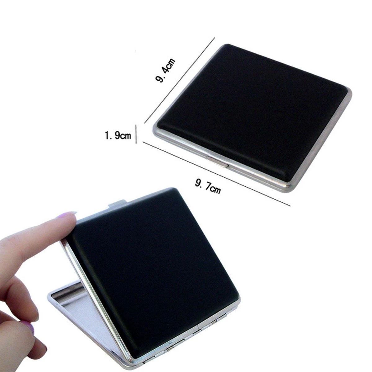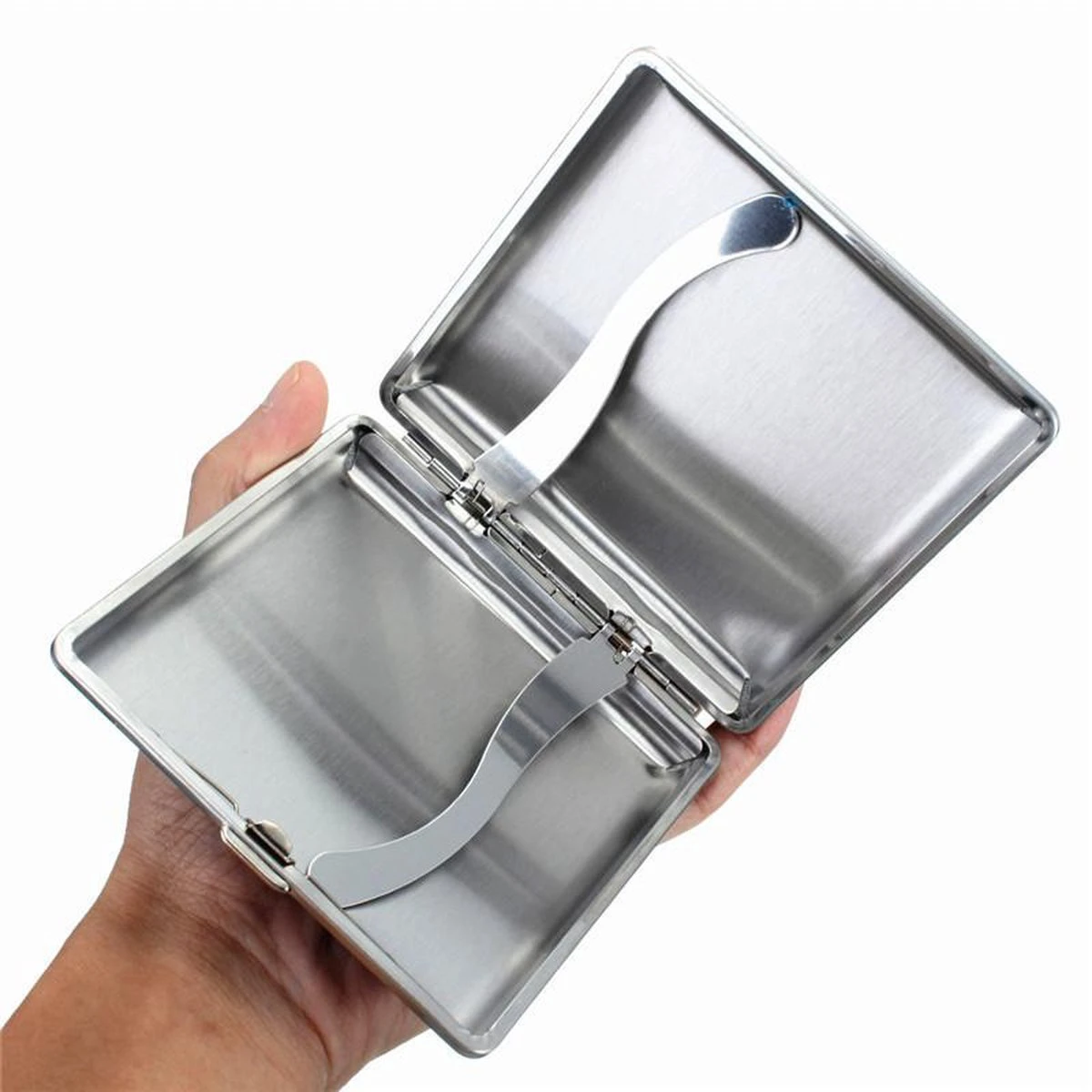 De afmetingen zijn 3,8 x 3,7 x 0,7 inch, wat een kleine en draagbare opbergdoos voor sigaretten is. Er zitten 2 veerkrachtige houders in om uw sigaretten op hun plaats te houden zonder ze te verpletteren, bediening met één hand via klep open en dicht roestvrijstalen deksel en zeer eenvoudig te bedienen.