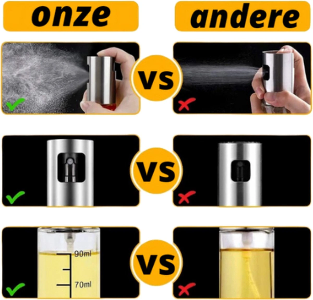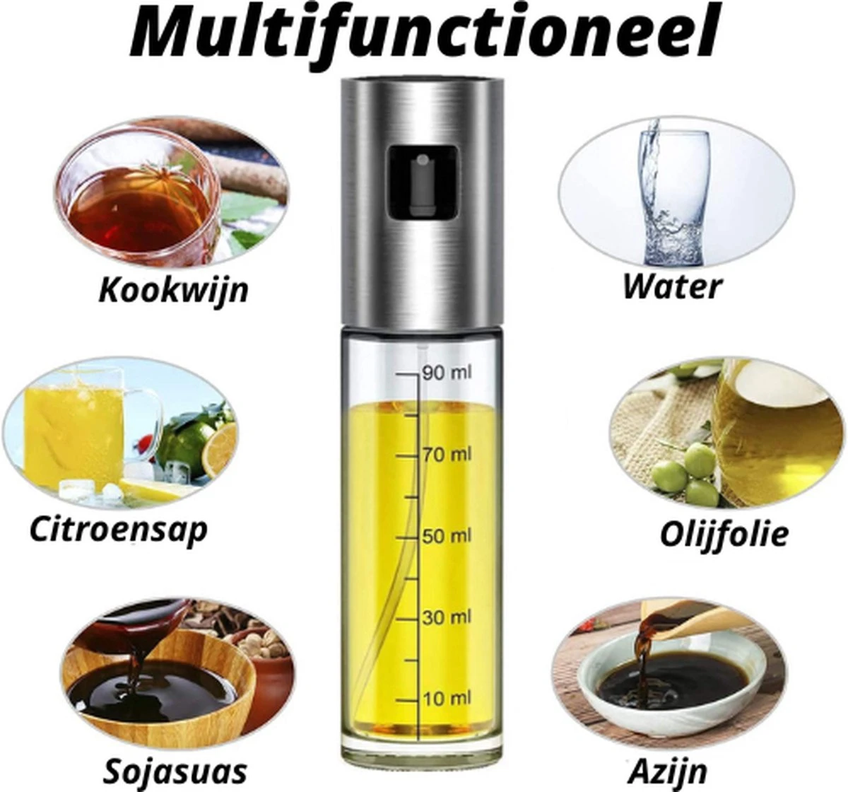 Gemaakt van hoogwaardig roestvrij staal, sterk dik glas en BPA-vrij. Het handige ontwerp toont een duidelijke schaalverdeling op de fles en door de uitstekende nevel verspil je minder olijfolie. Handig toch?