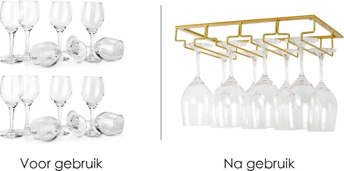 Deze metalen wijnglazenhouder is tevens ideaal om je ruimtegebrek in de kast mee op te lossen. Bevestig de wijnglazenhouder onder het keukenkastje, in de kast of op een andere geschikte plaats en u kunt er 12 wijnglazen in kwijt.