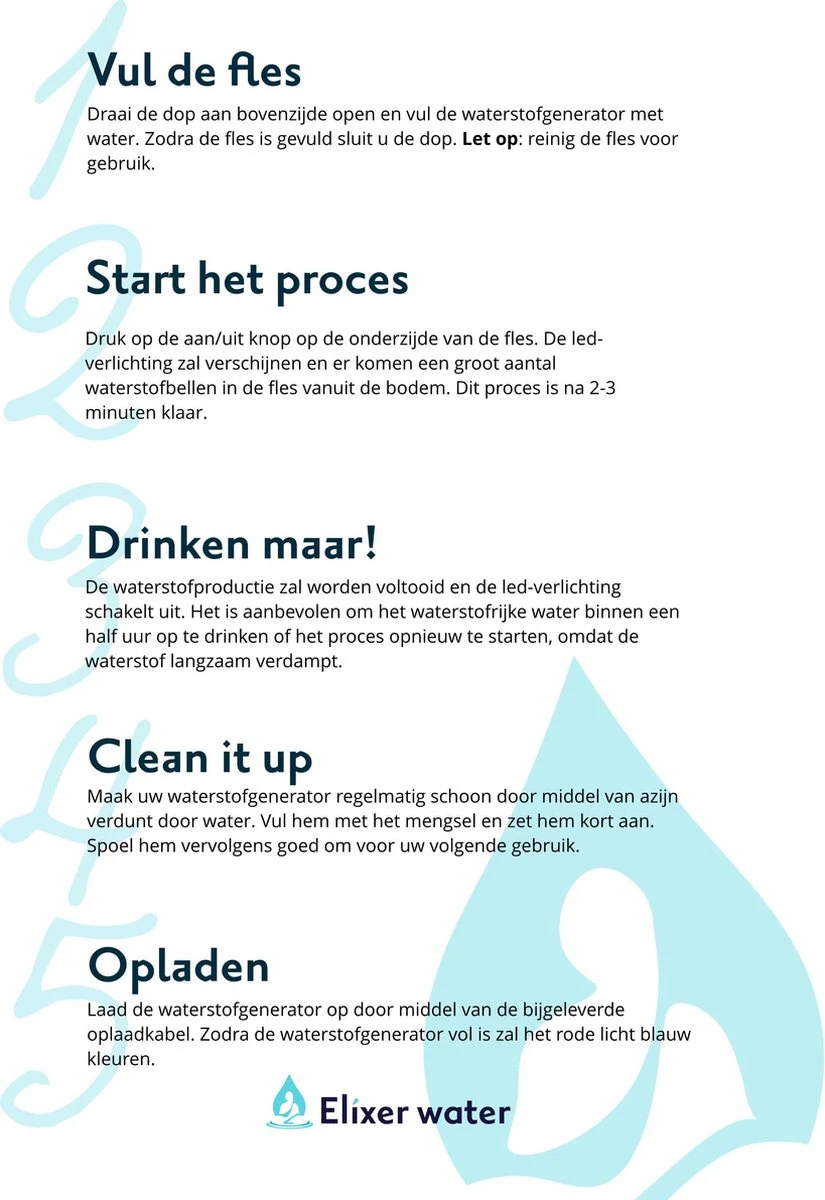 Met Elixer Water waterstofgenerator maak je het krachtigste drinkwater vanuit thuis. Deze oplaadbare waterstof generator kun je overal mee naar toe nemen vanwege de compactheid en het lichtgewicht. Met deze chique en esthetische ontworpen waterstofgenerator maak je binnen 3 minuten een glas waterstofrijk drinkwater.