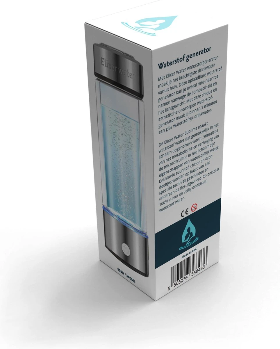 De Elixer Water Sublime maakt waterstof water dat gemakkelijk in het lichaam opgenomen wordt. Stimulatie van het metabolisme en verhoging van de microcirculatie in het lichaam zijn eigenschappen van waterstofrijk water. Eventuele zuurstof, chloor en ozon deeltjes worden op basis van een speciale techniek gescheiden en onderaan de fles afgevoerd. Zo ontstaat 100% zuiver en veilig drinkbaar waterstof water.