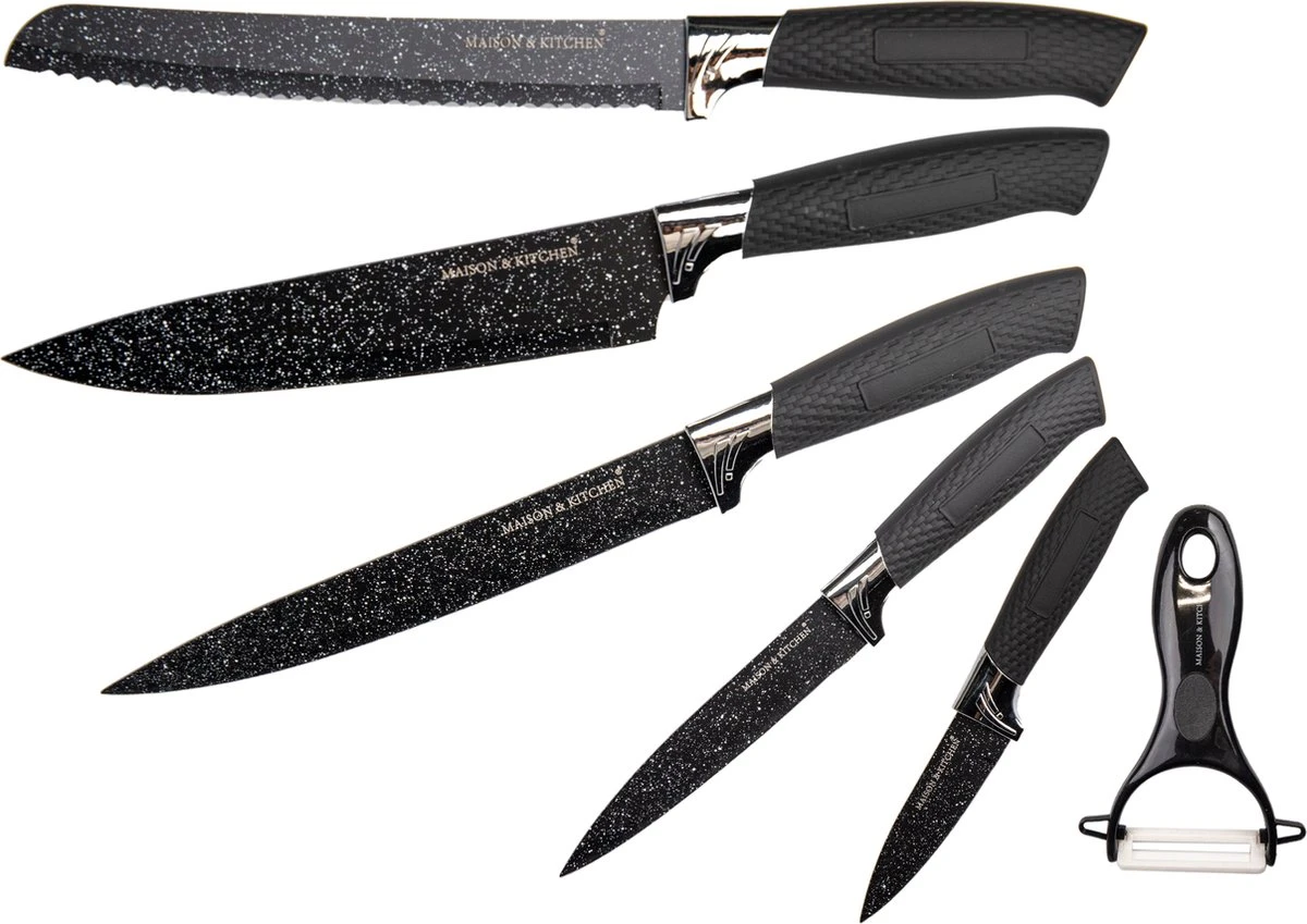 Nieuw Messenset van Maison & Kitchen 6-delige maakt uw keuken compleet. Bereid je eten vol vertrouwen met ergonomische anti – slip handgrepen. Non-Stick coating zorgt voor hygiëne en eenvoudige reiniging RVS lemmet behoudt zijn scherpte voor een lange tijd. Bonus: Dunschiller