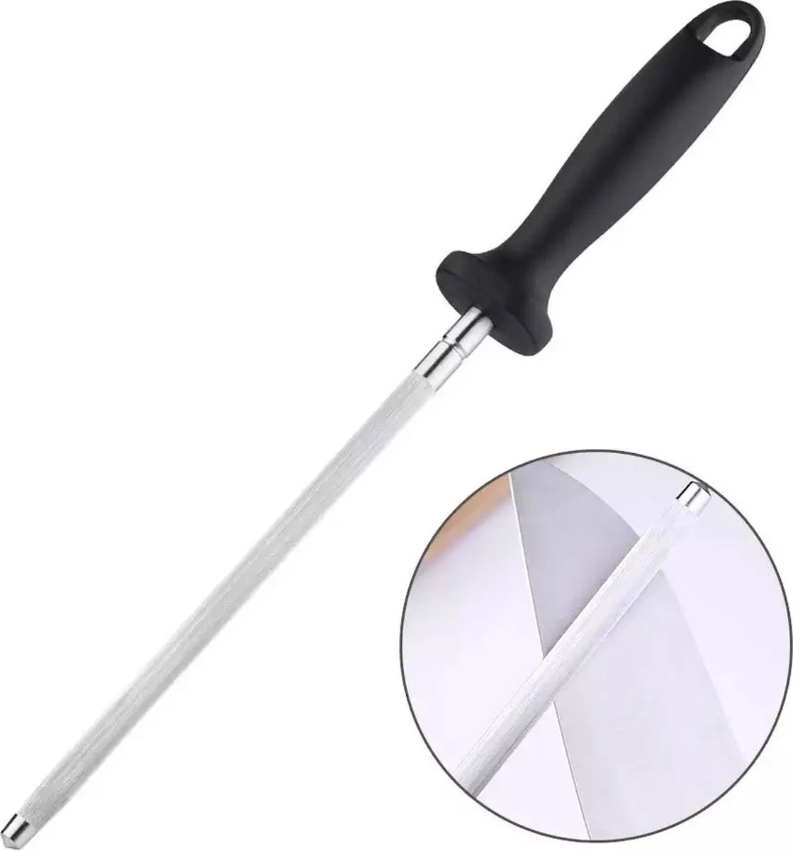 Dit aanzetstaal is gemaakt van gehard RVS en heeft een kunsstof handgreep. De staande handgreep beschermt u tegen snijwonden tijdens gebruik. Gebruik de haak aan het uiteinde van het aanzetstaal om hem simpelweg de praktische op te hangen