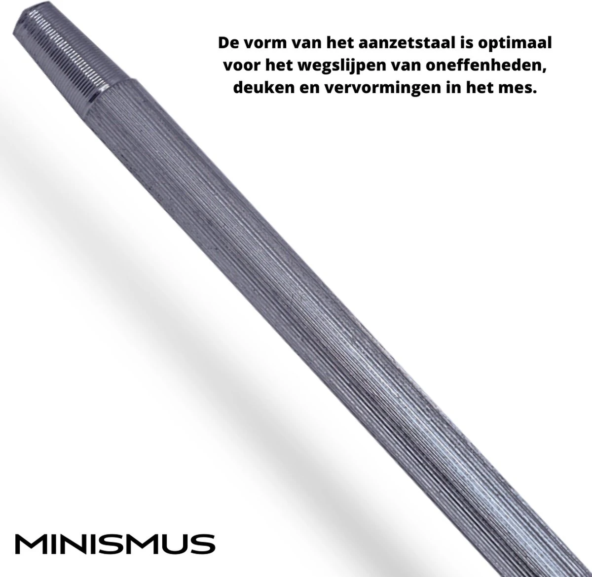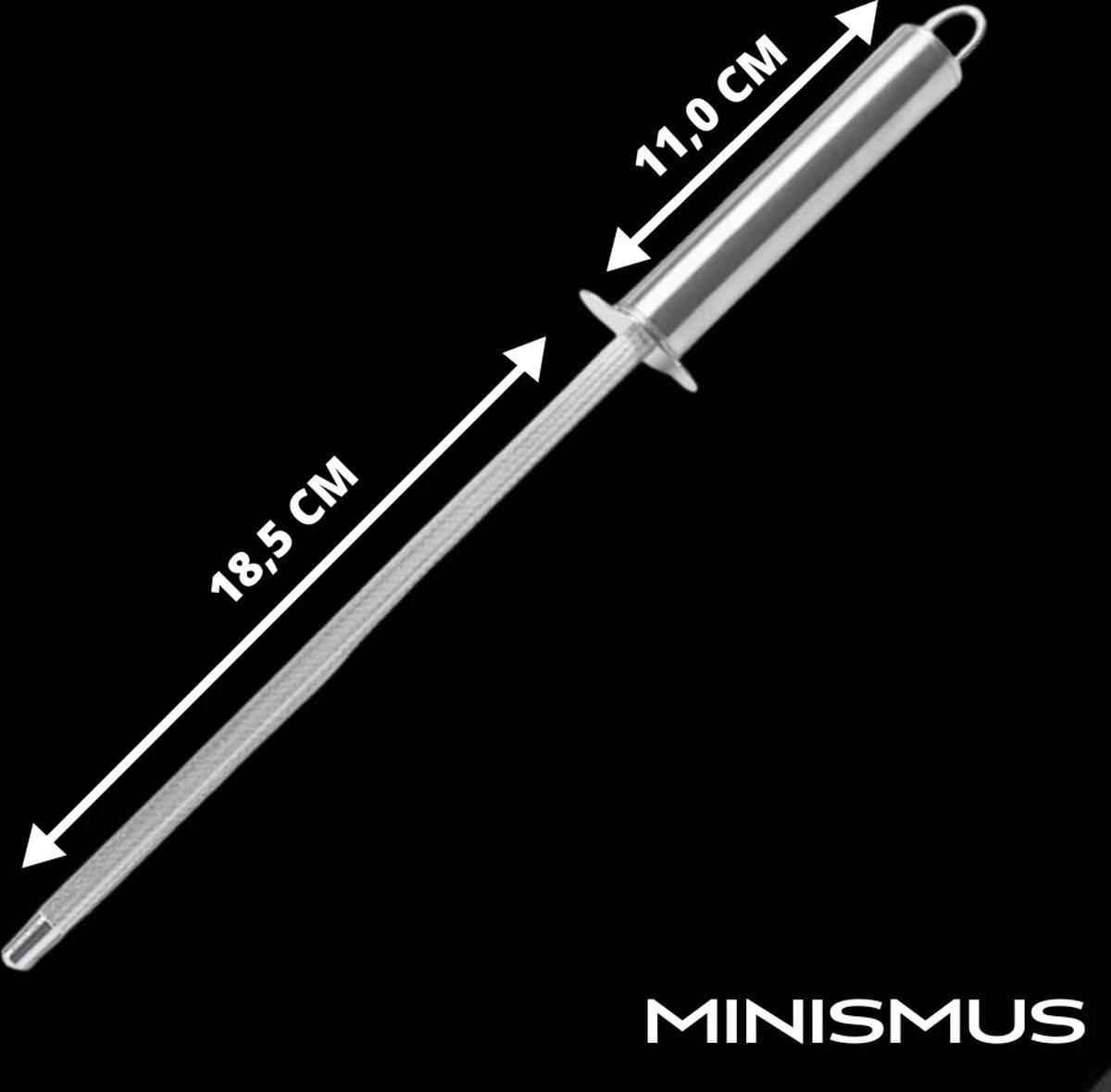 - PREMIUM ROESTVRIJ STAAL – Het professionele aanzetstaal van Minismus voor messen is gemaakt van geribbeld, koolstofrijk en hard verchroomd staal. Dit hoogwaardige roestvrij staal maakt een bijzonder snel en krachtig slijpen van een breed scala aan messen mogelijk.