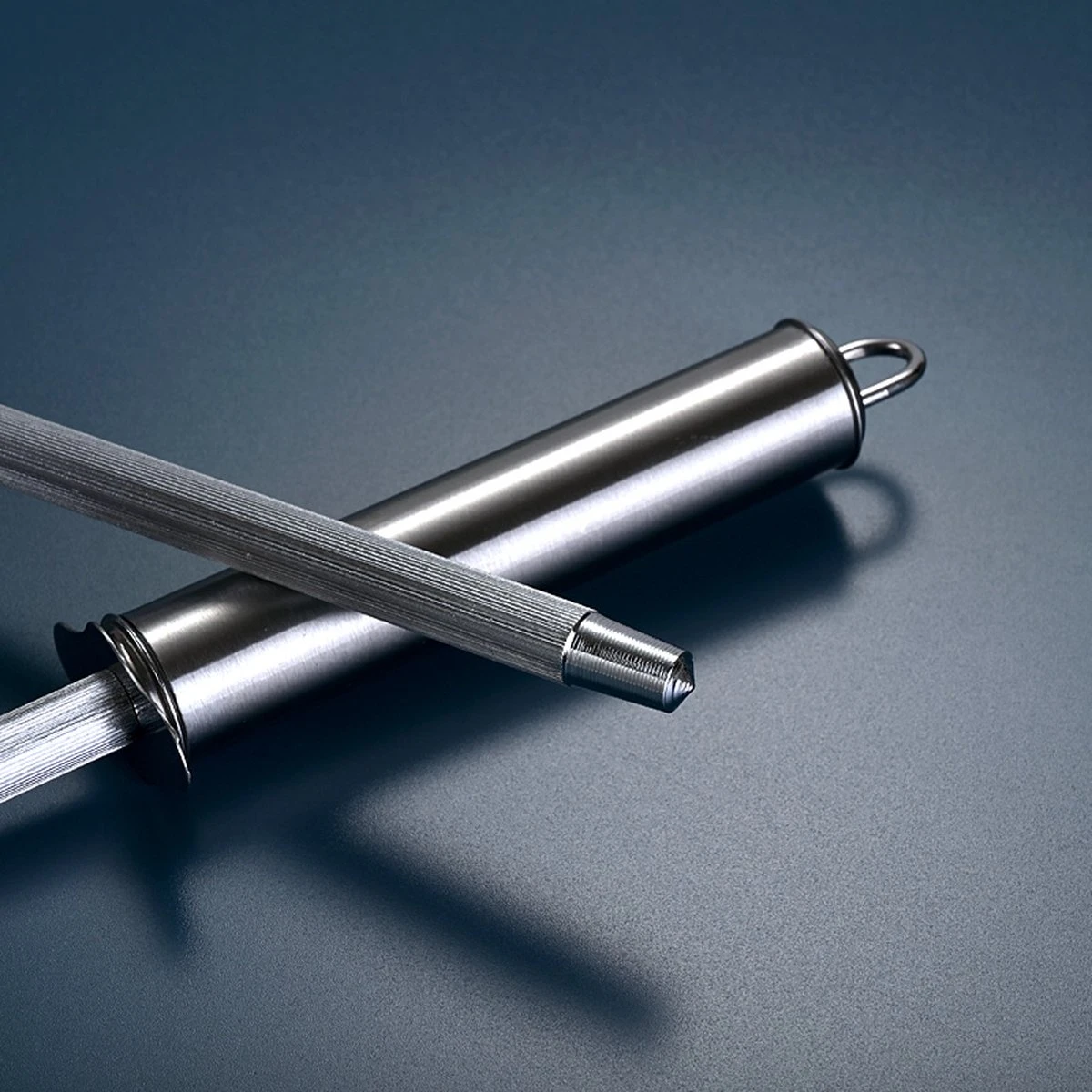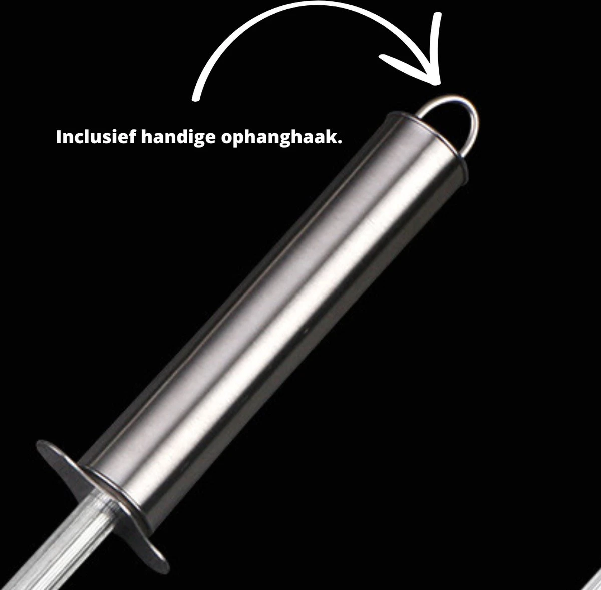 Dit aanzetstaal is gemaakt van gehard RVS. De staande handgreep beschermt u tegen snijwonden tijdens gebruik. Gebruik de haak aan het uiteinde van het aanzetstaal om hem simpelweg de praktische op te hangen