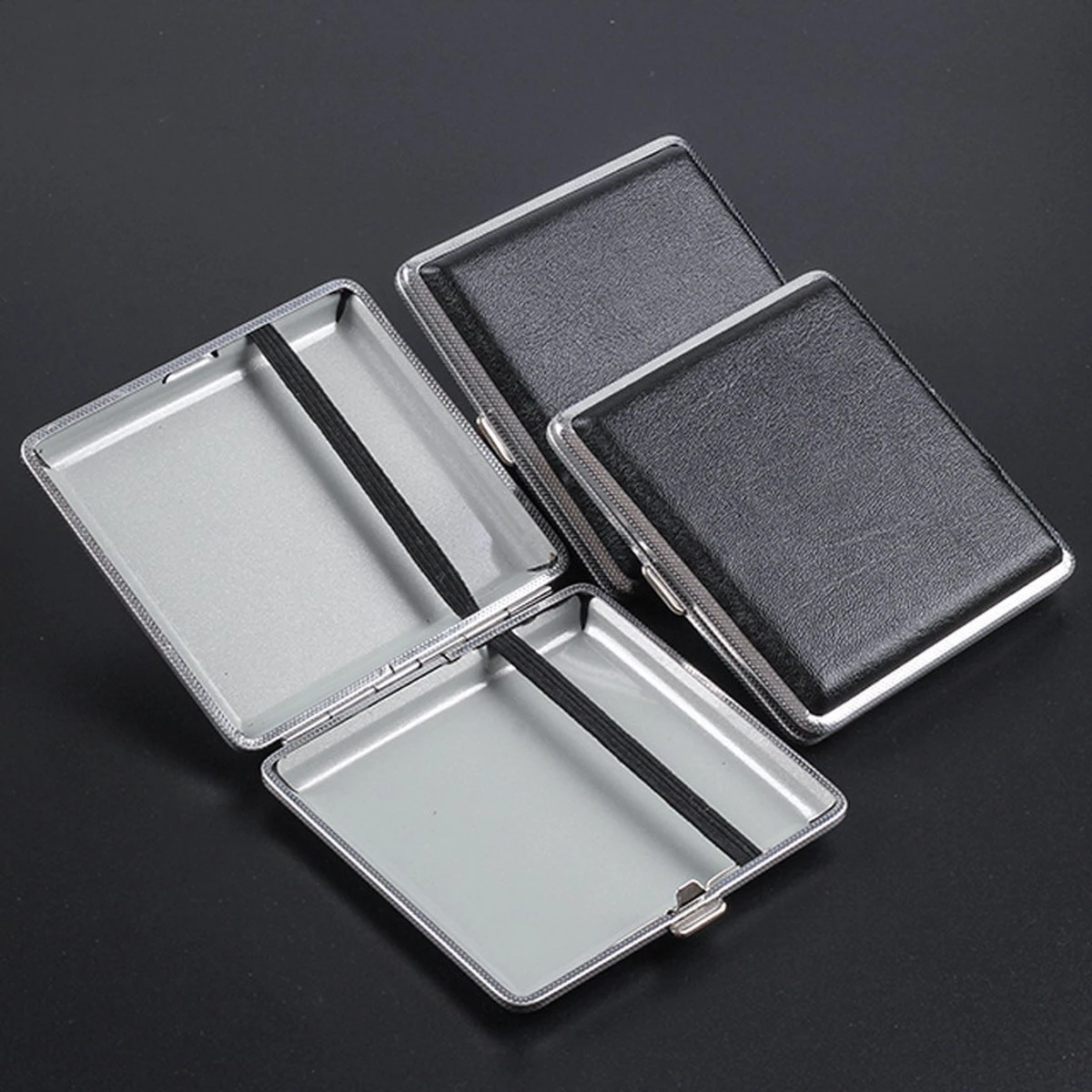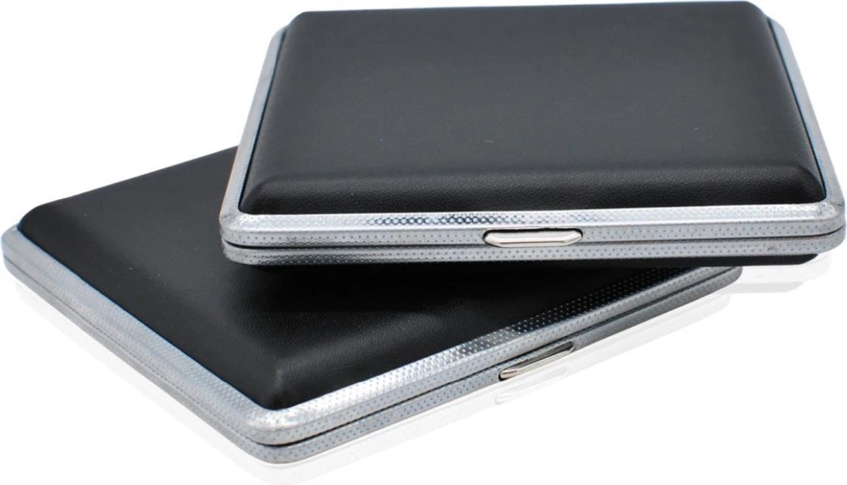 Onze sigarettenhouder is gemaakt van zwart leer en roestvrij staal. Het leer is egaal zwart en heeft een nette afwerking rondom het gepolijste stalen frame. Tevens is de sigarettenhouder voorzien van een sluiting met klikmechanisme dat het ongemerkt opengaan voorkomt. Verder zorgen de twee elastieken ervoor dat uw sigaretten niet uit het doosje vallen wanneer u de sigarettenhouder opent.