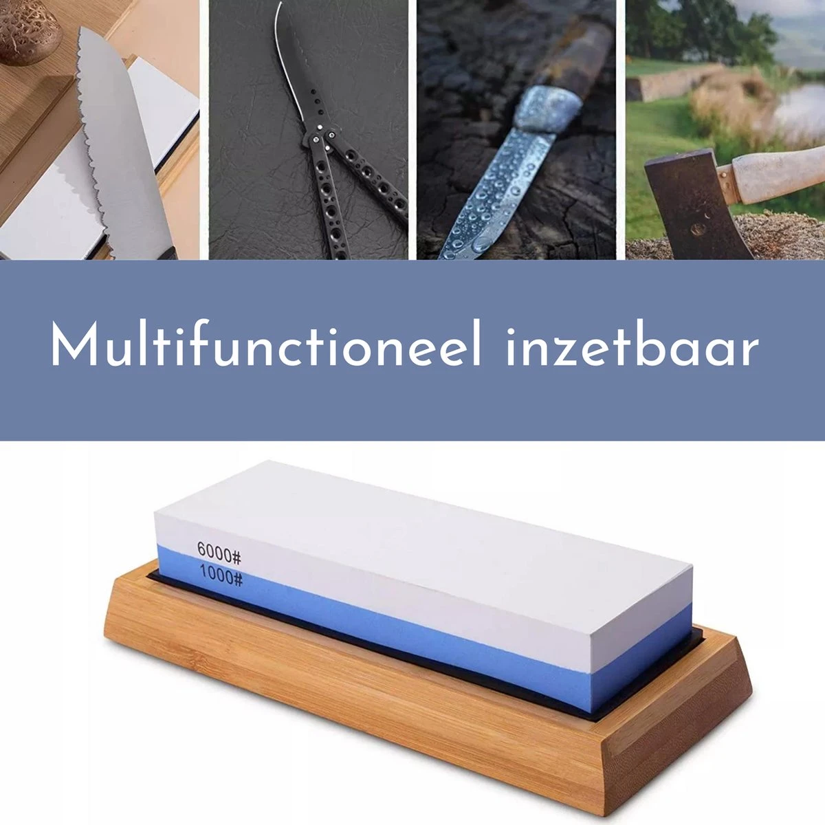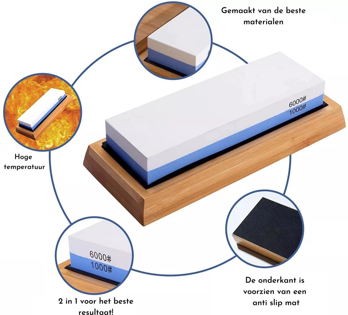 De wetsteen heeft 2 verschillende zijden, de witte zijde korrel 6000, en de blauwe zijde korrel 1000. Omdat de westeen van Muntel® deze twee combinaties heeft, hoeft u dus maar 1 wetsteen te kopen om u messen weer vlijmscherp te krijgen. We westeen word geleverd met een bamboe houder een een anti-slip rubber, ook is de onderkant van het bamboe bakje voorzien van anti slip. Zo hoeft u niet bang te zijn dat de slijpsteen gaat schuiven tijdens het slijpen.