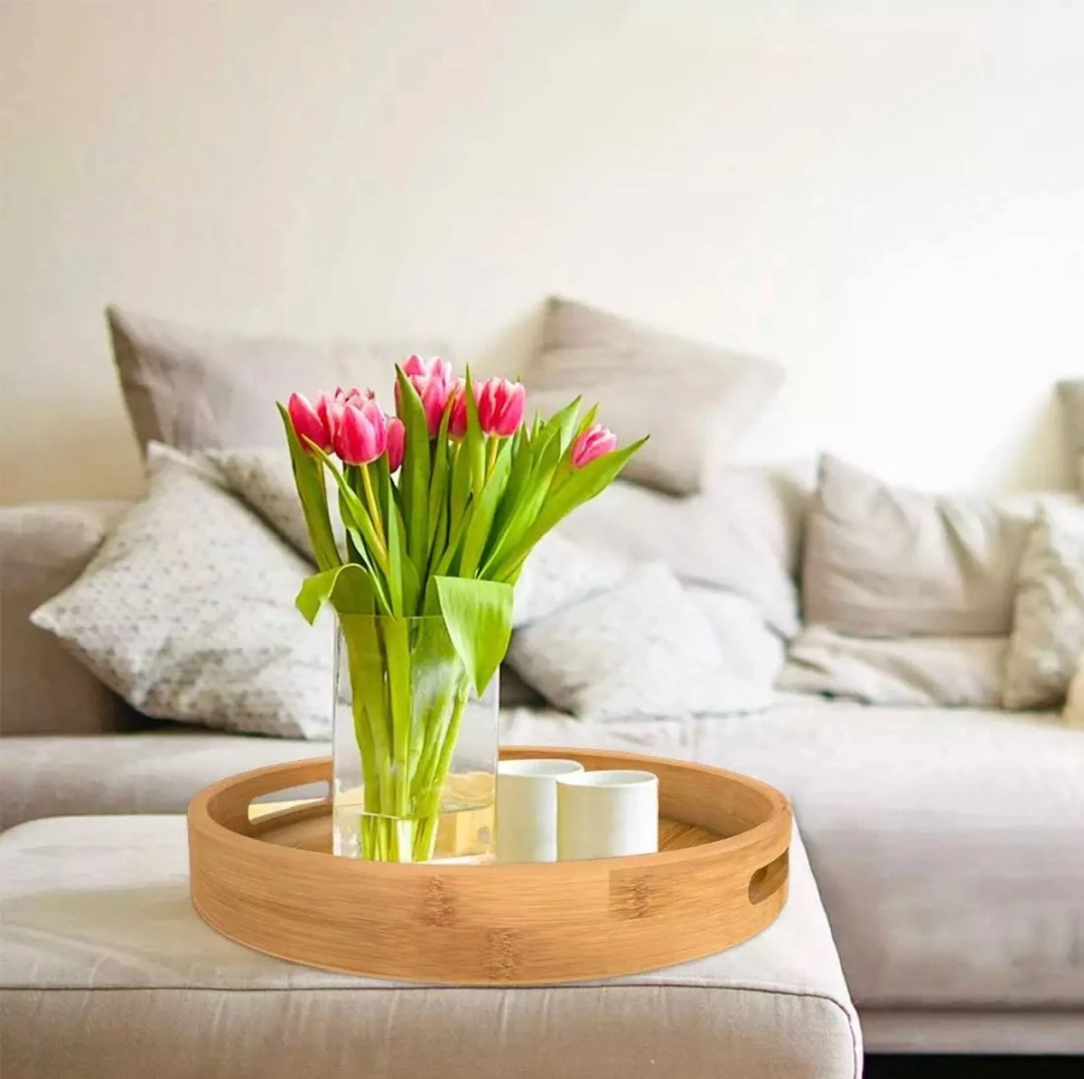 Bamboe Dienblad Rond – Ø30 cm. Rond Dienblad met handvatten gemaakt van Bamboe hout,Voorzien van 2 stevige handvatten & Verhoogde randen. Afmetingen: 30x 30 x 5 Cm