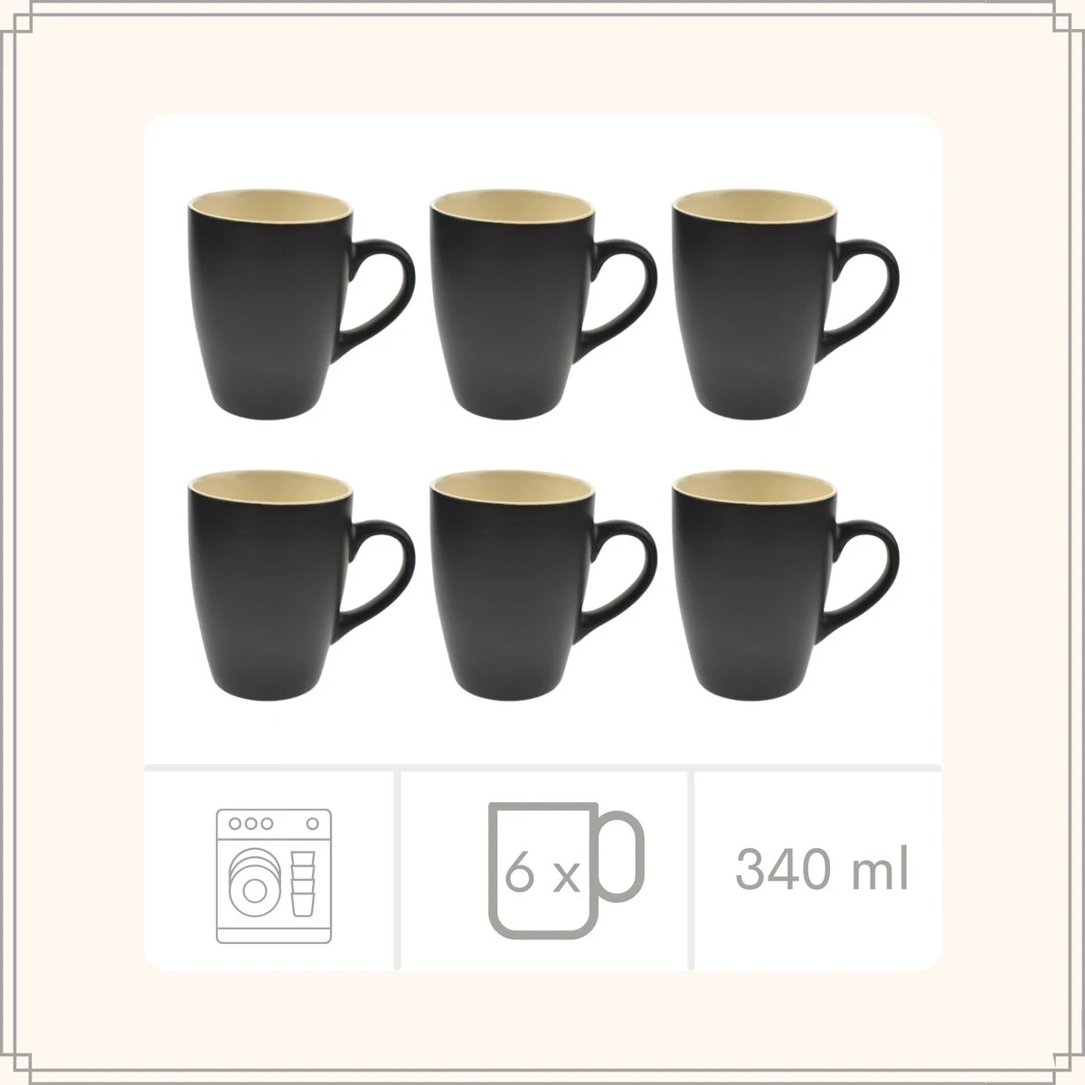- Kleur: Mat zwart met crème kleurige binnenkant