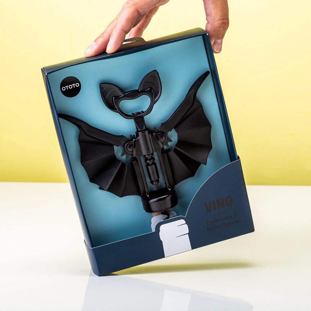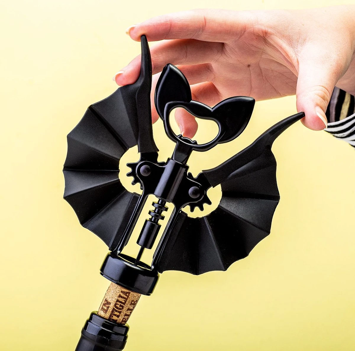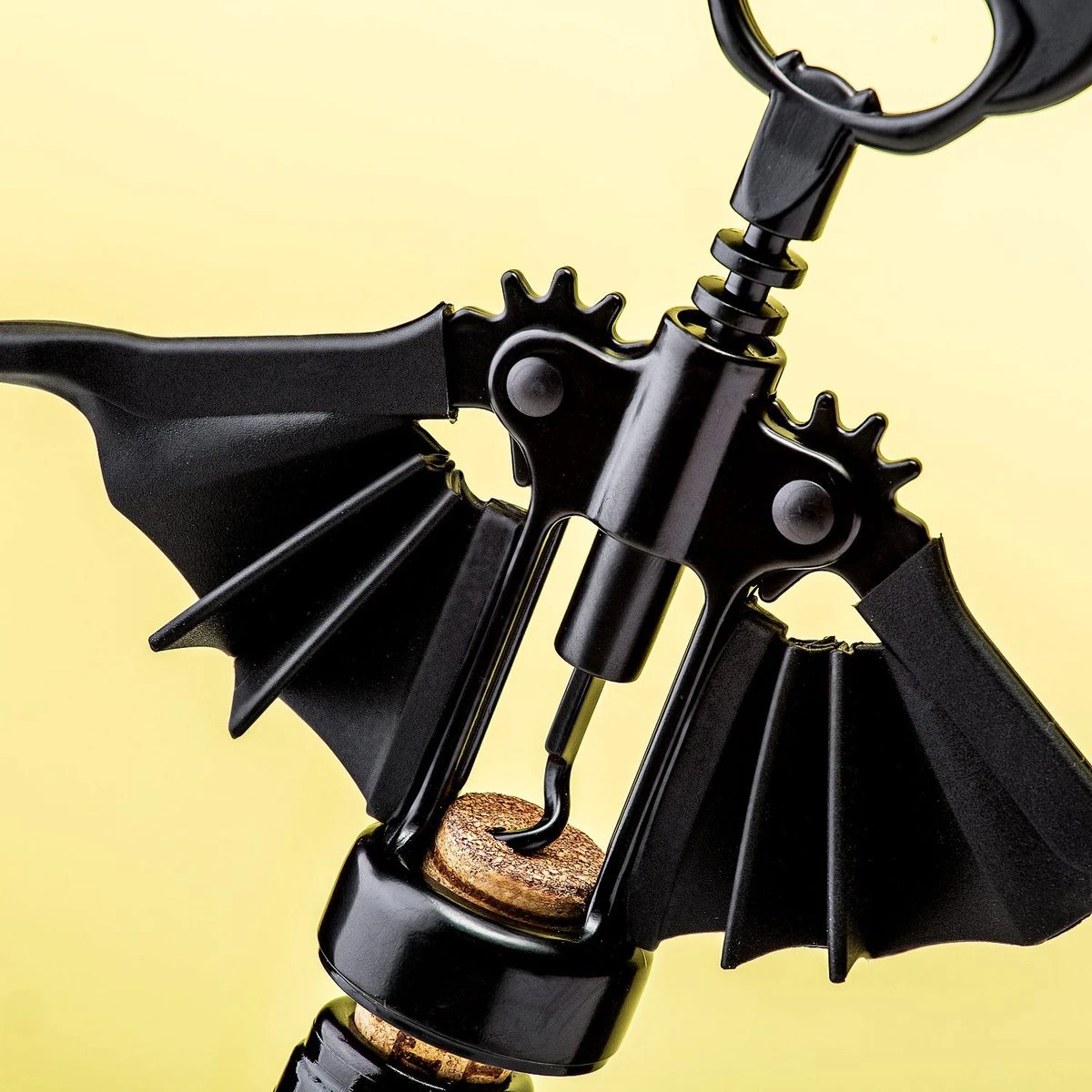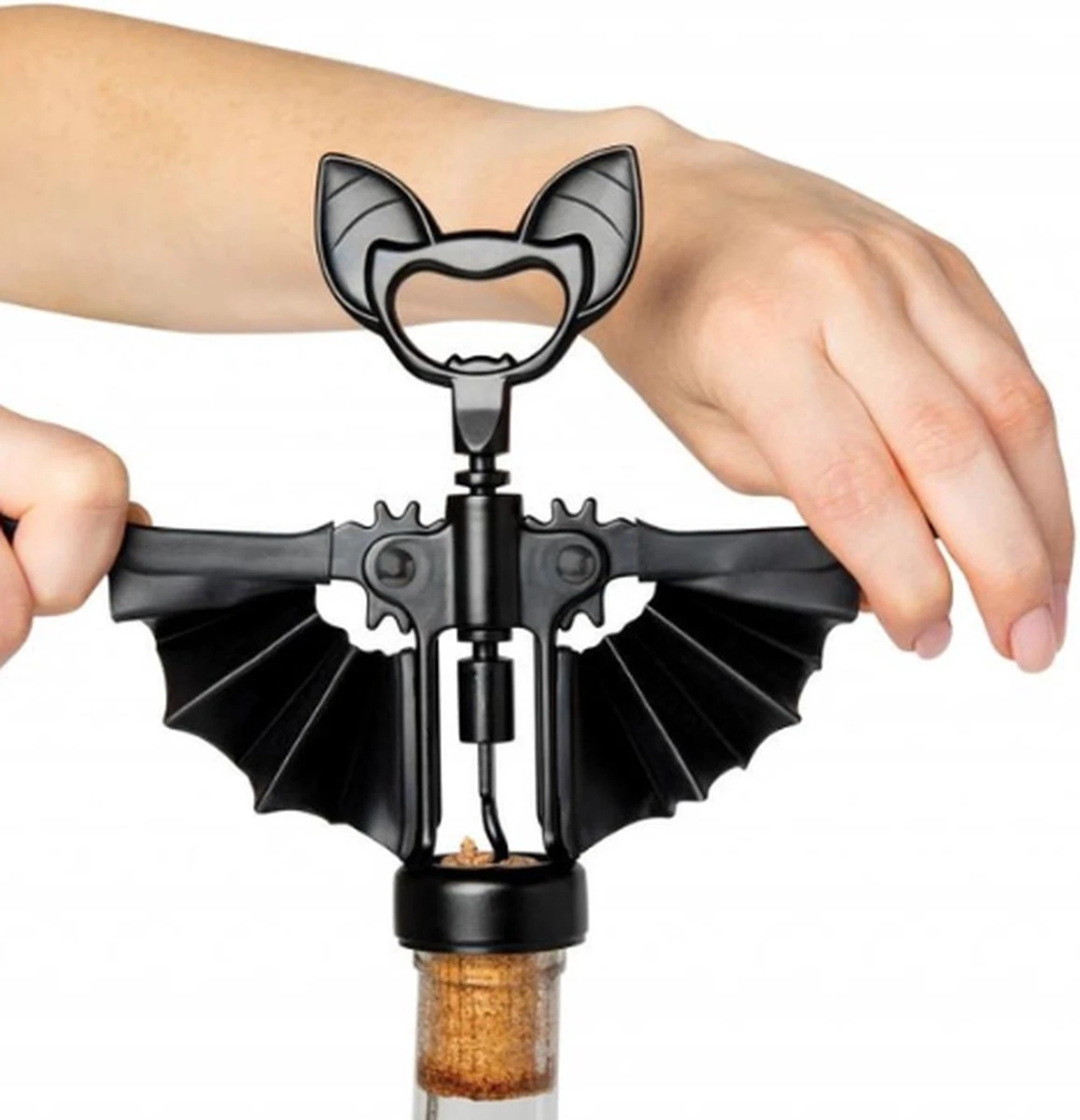 Mysterieuze, intrigerende kurkentrekker en flesopener in de vorm van een vleermuis. Maak snel de fles open en laat de vleermuis vliegen!