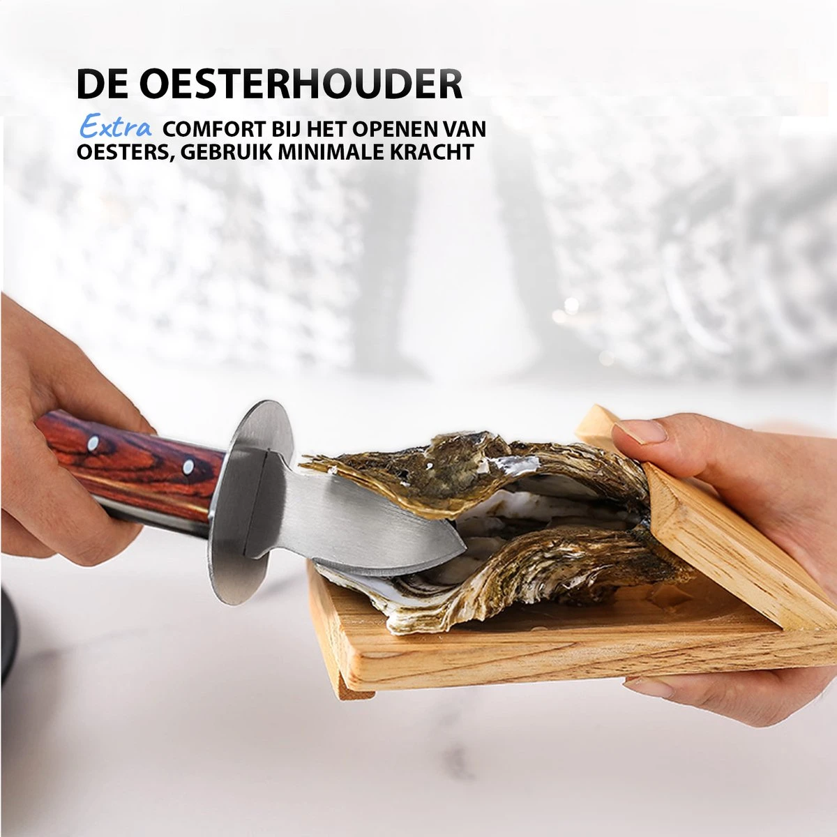 De oesterhouder -gemaakt van hout- biedt extra comfort bij het openen van een oester. De houder zorgt ervoor dat de oester met minimale kracht tóch goed op zijn plek blijft en daarmee dus makkelijk geopend kan worden.