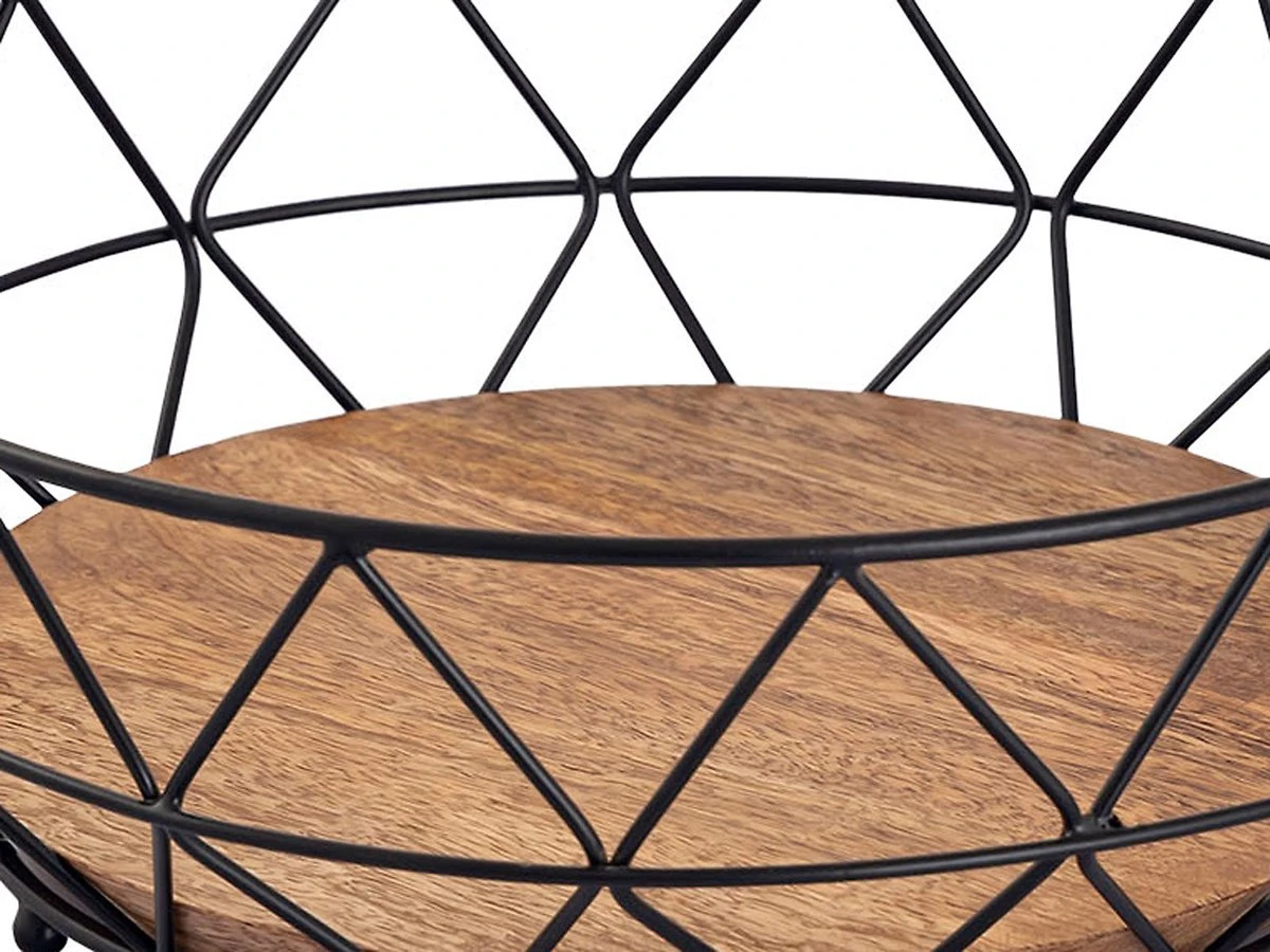 Fruitmand metaal met een mooie structuur en massief houten bodemplaat ziet er zeer hoogwaardig en nobel uit