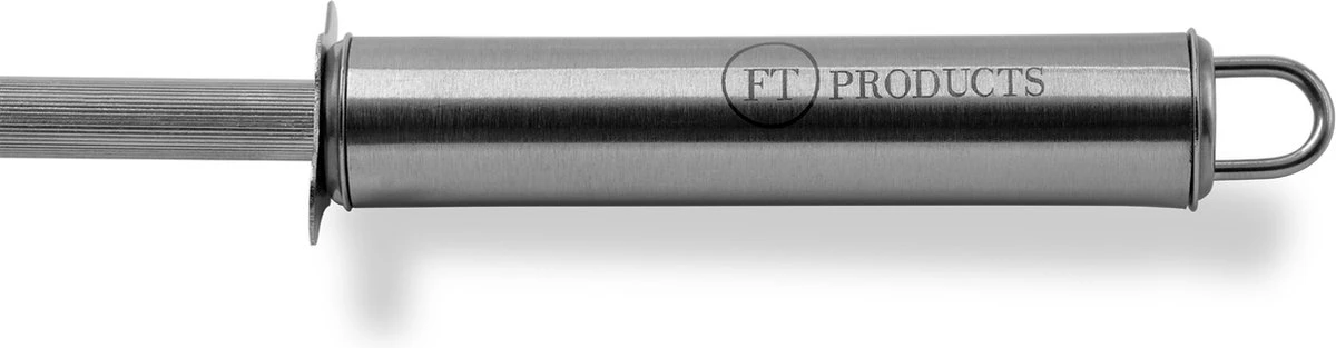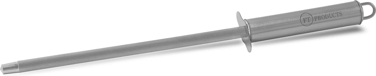 Dit aanzetstaal is gemaakt uit gehard RVS. Het opstaande handvat bevat ons logo en beschermd u tegen snijwonden tijdens het gebruik en door de handige haak op de achterkant simpel op te hangen. Deze messenslijper is ideaal om uw messen scherp te houden en uiteraard is ieder type mes hiermee te slijpen.