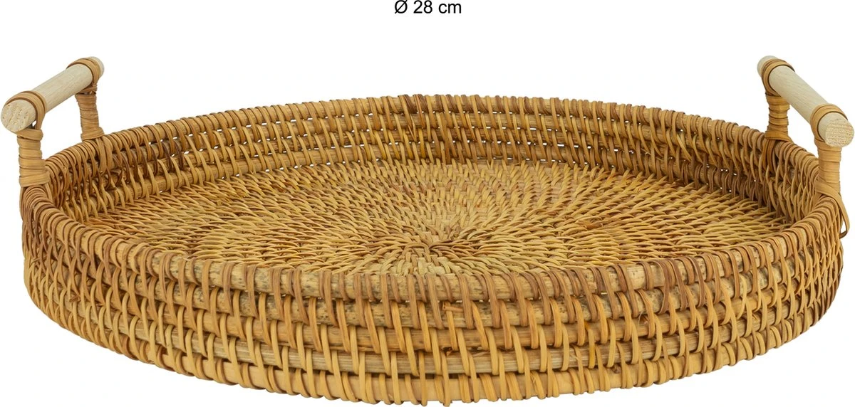 Dit schitterende dienblad van rotan is een perfect voorbeeld van hoe functionaliteit gecombineerd kan worden met design. Het dienblad met handvaten is gemakkelijk te verplaatsen en biedt met een diameter van 28 centimeter voldoende plaats voor allerlei spullen. Tegelijkertijd zorgt het rotan materiaal voor een natuurlijke en rustgevende uitstraling. Zo is dit dienblad een serveerblad en woonaccessoire in één.