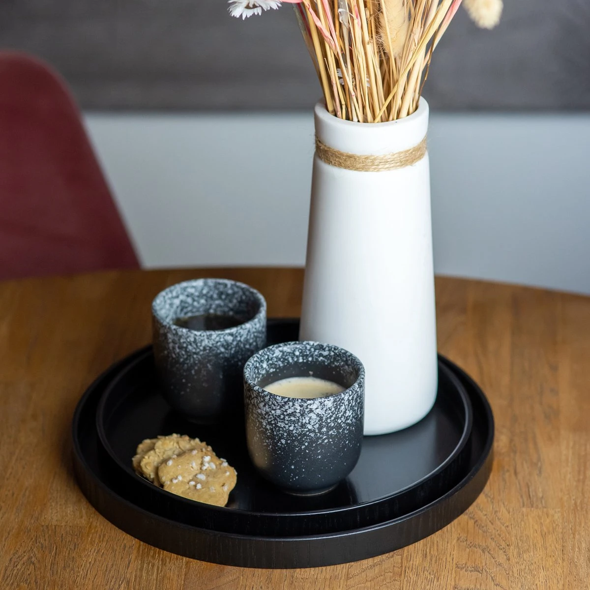 Het dienblad heeft een ronde vorm met een hogere rand. De oppervlakte is perfect glad, wat zorgt voor een moderne en elegante uitstraling. Ook de zwarte kleur draagt hieraan bij.