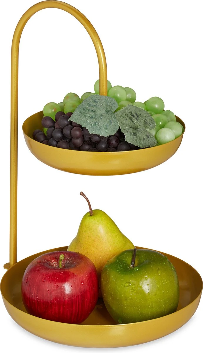 Het oog wil ook wat! Dankzij deze stijlvolle fruitmand smaken appels, bananen, druiven en ander fruit voortaan nog beter. De goudkleurige fruitschaal etagère is met zijn 2 lagen een echte blikvanger in je keuken die goed past bij elk interieur. Maar ook op tafel komt hij goed van pas want je kunt er het fruit heel leuk mee presenteren. De stabiele etagère is ook geschikt om er koekjes, muffins en ander gebak stijlvol mee te serveren.