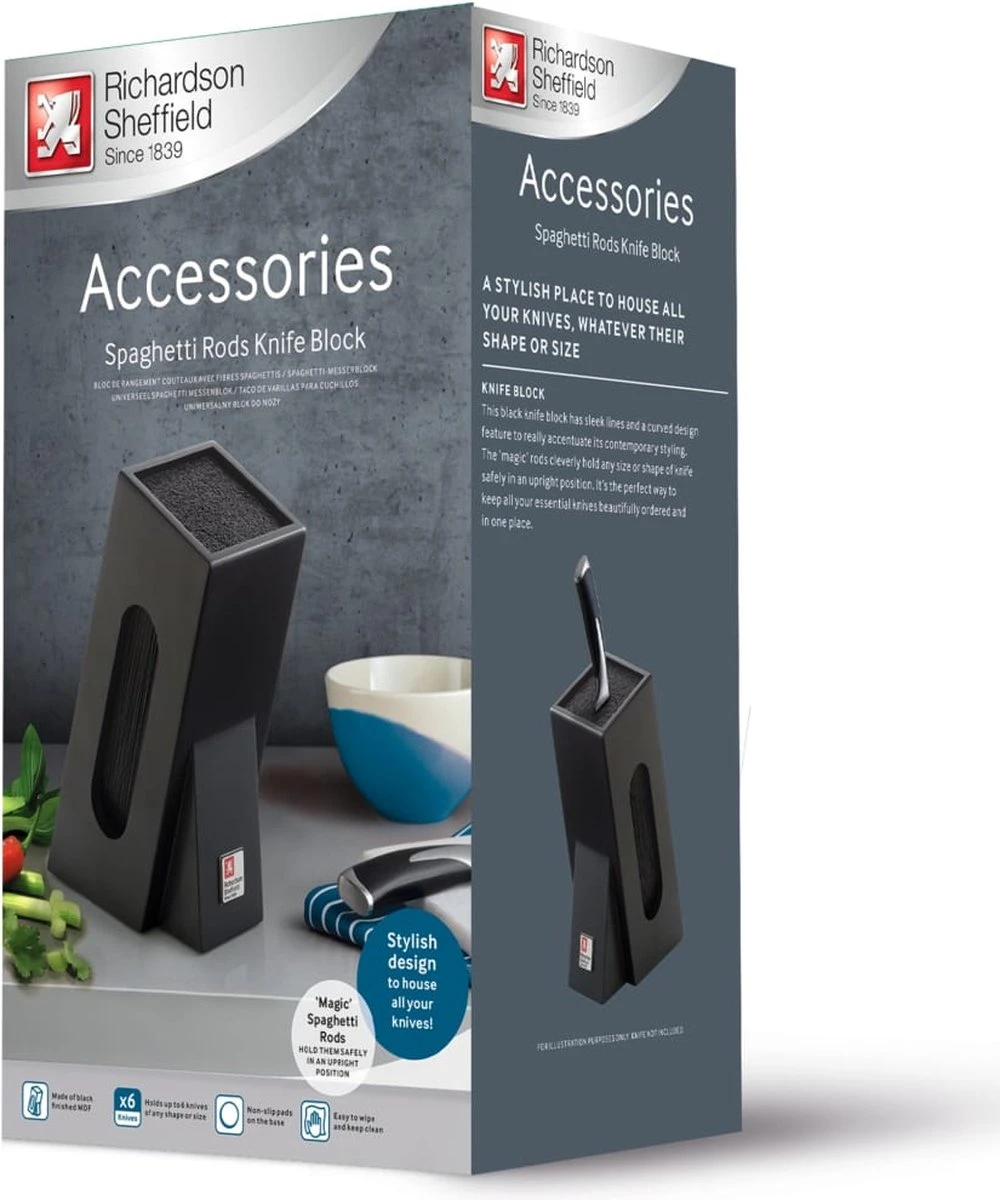 Het universele Richardson Sheffield spaghettistaafjes messenblok is gemaakt van de beste materialen en is een perfect hulpmiddel om al je essentiële kookmessen perfect geordend en op één plek te houden.