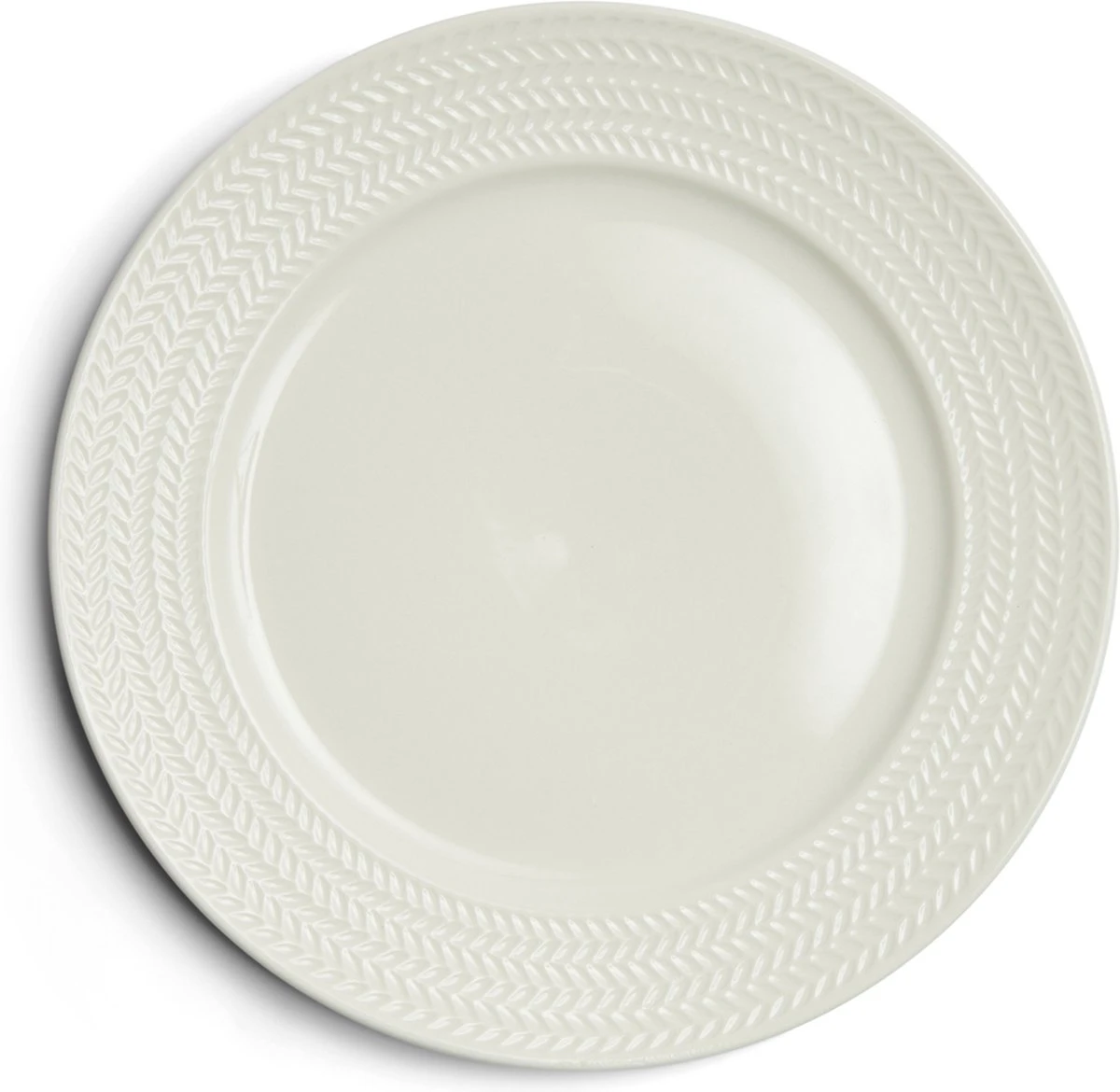 Wat opvalt aan dit dinerbord uit de RM Bellecôte serviesserie is de sierrand die gevlochten lijkt te zijn in een mooie visgraat. Een rustig decor, waardoor alle aandacht kan gaan naar de heerlijke maaltijd op het bord. Komt goed tot zijn recht op een mooi gekleurd tafellaken.