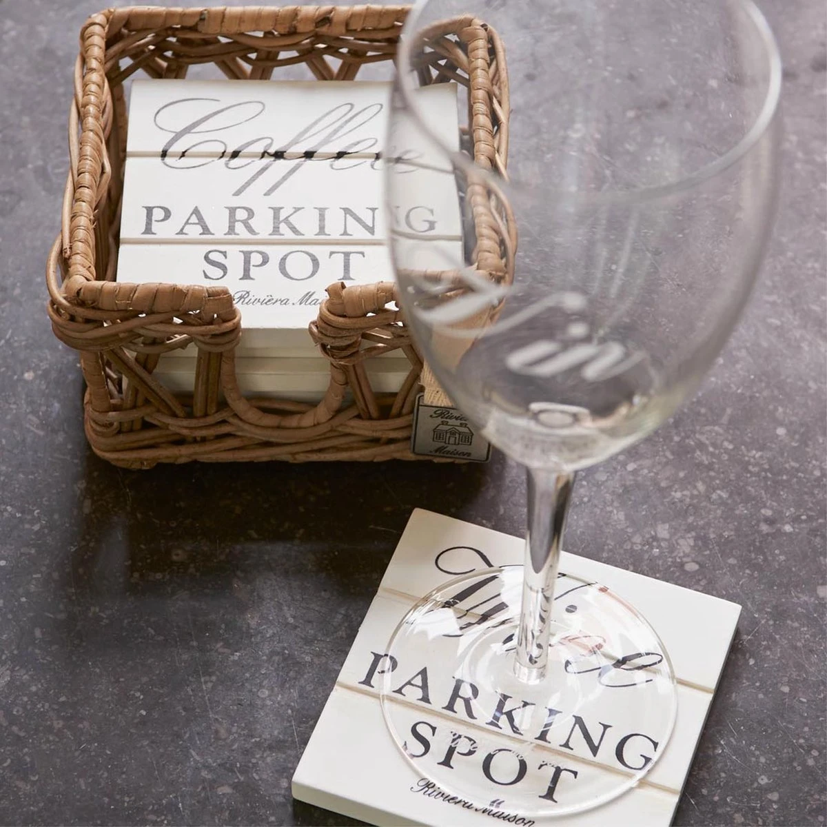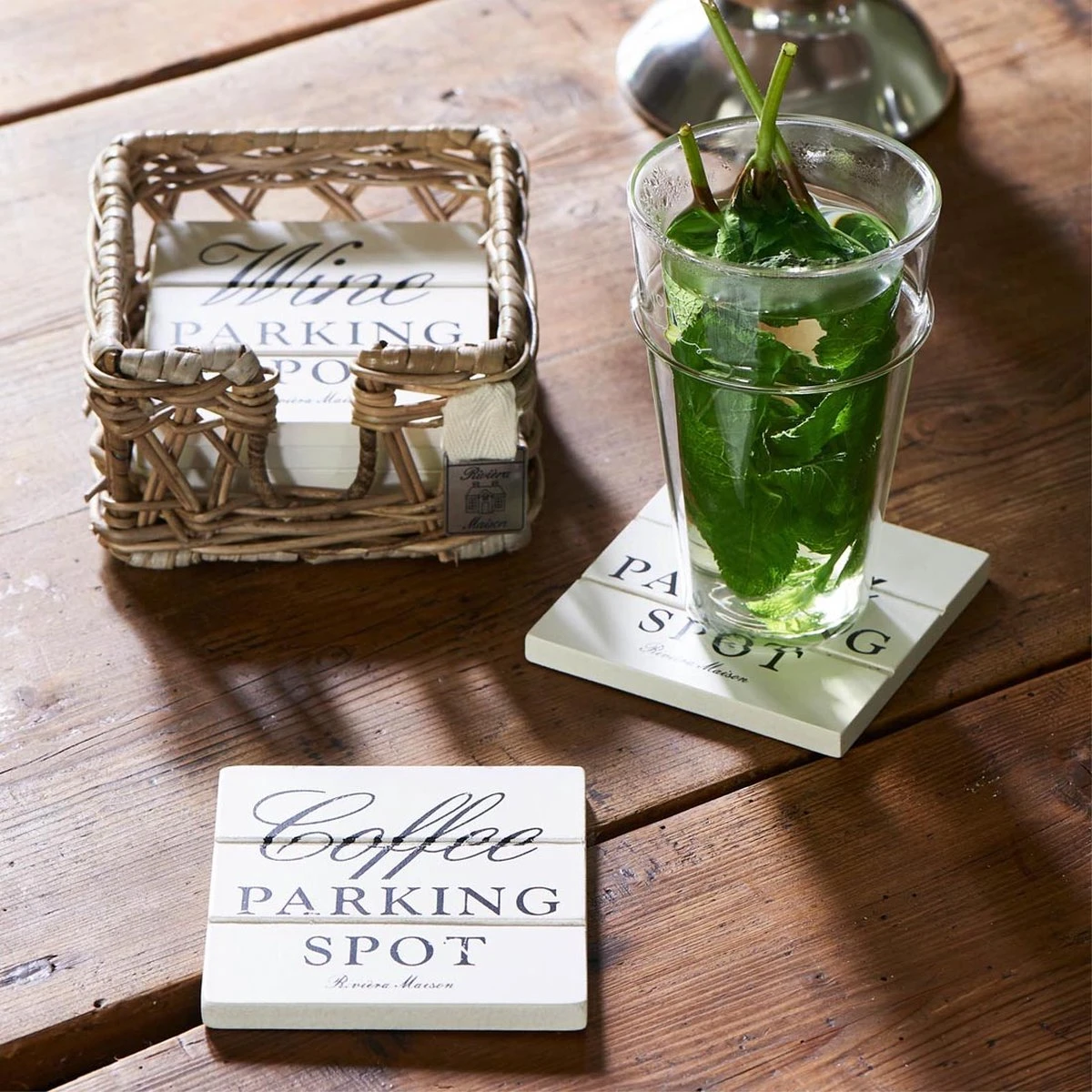 Deze rotan houder heeft zes houten onderzetters. Hiermee beschermt u uw tafelblad tegen de kringen die glazen kunnen achterlaten en de hitte van de warme dranken. De onderzetters zijn gedecoreerd met de toepasselijke teksten ‘wine parking spot’, ‘tea parking spot’ en ‘coffee parking spot’. Ieder drankje zijn eigen parkeerplaats.