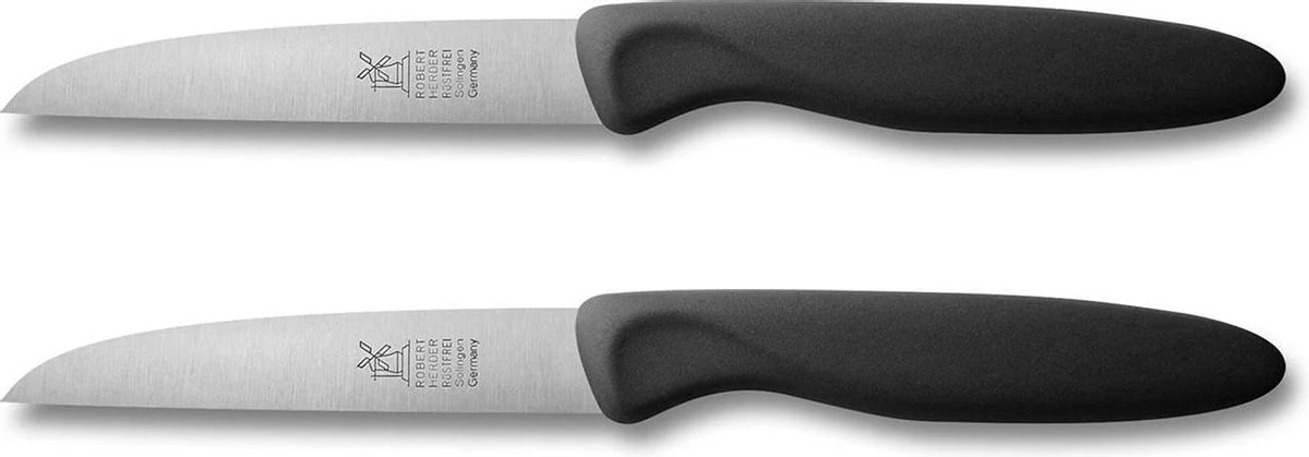 Dit schilmes van Robert Herder heeft een lemmetlengte van 8,5cm en is een ideaal mes voor het schillen en snijden van groenten en fruit, vis en vlees. Met kunststof heft kan het na gebruik gewoon in de vaatwasser gereinigd worden. Het lemmet is gemaakt in dubbel gehard roestvrij staal met hoog koolstofgehalte, en wordt nog op de traditionele manier met de hand geslepen en gepolijst. Door de hardheid van het staal en de handmatige slijptechniek, kan het lemmet dunner geslepen worden en is de snede scherper zodat je met meer precisie en gemak kan snijden. Het mes blijft ook langer scherp. Net iets minder performant dan de koolstofstalen schilmessen van Robert Herder, is de roestvrijstalen versie een perfect alternatief voor koks die een corrosievrij mes verkiezen.