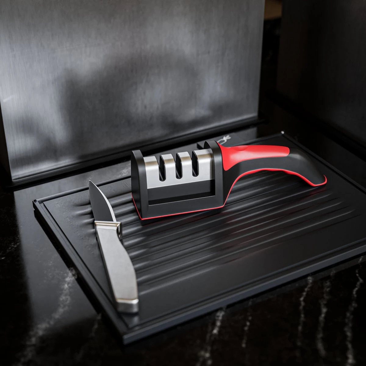 - Zorg dat de messenslijper op een vlakke ondergrond staat.