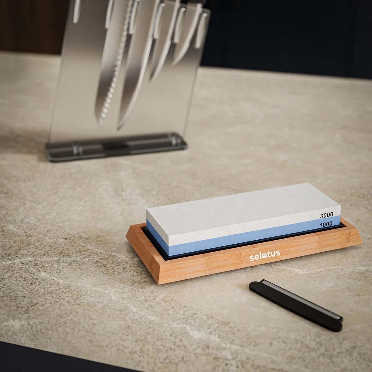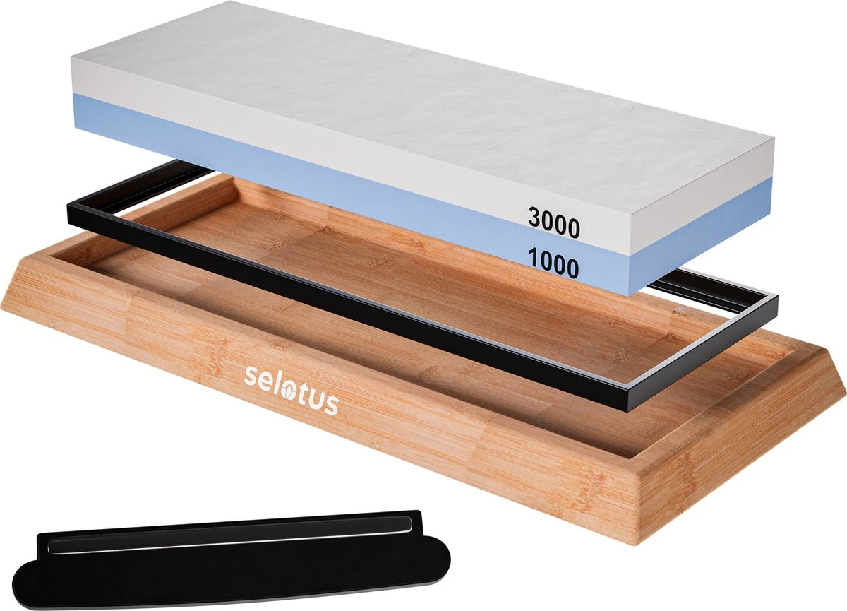 Met de slijpsteen van Selotus worden uw messen moeiteloos weer vlijmscherp. Elke professionele chef-kok of hobbyist weet hoe vervelend het is om in de keuken te werken met een bot mes. Deze messenslijper heeft een grit van 1000 en van 3000 (2 kanten) komt inclusief handgemaakte bamboe basis, anti siliconen slip laag en een accessoires voor de juiste hoek tijdens het slijpen.