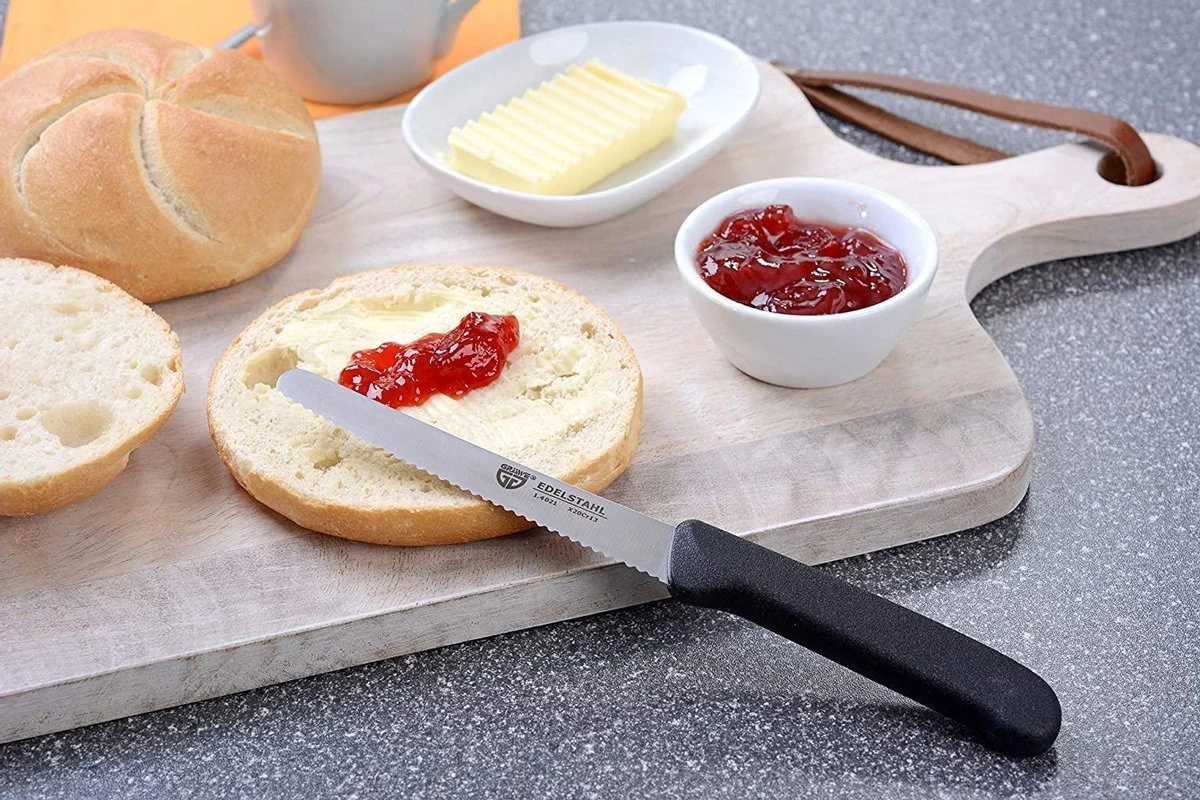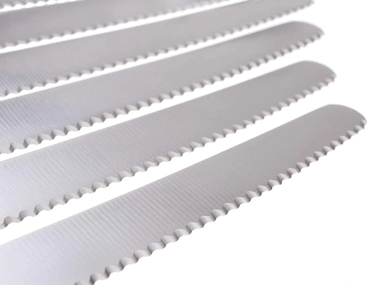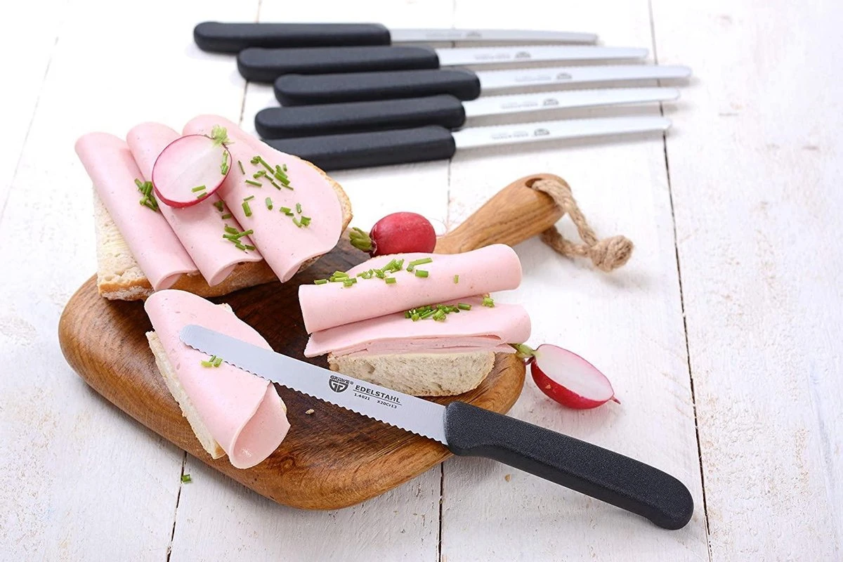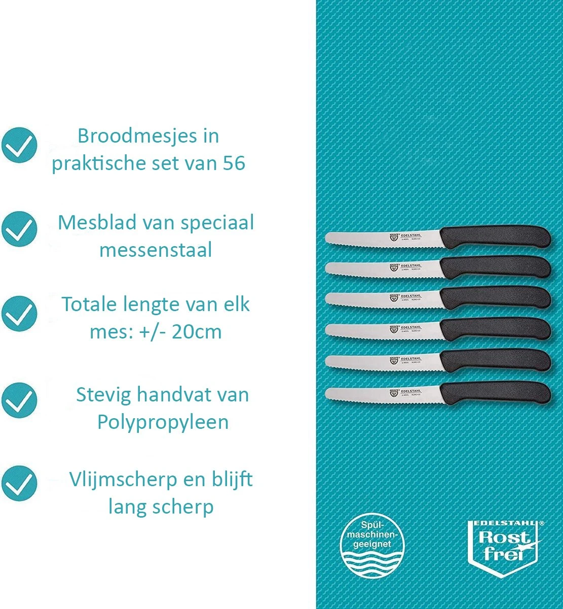 De gekartelde broodmesjes zijn handig om te gebruiken bij het ontbijt en bij de lunch. Broodjes snijden wordt een gemak met deze set van messen van bijzonder hoge kwaliteit. Naast brood zijn de messen ook ideaal om te gebruiken om gegrild vlees en pizzagerechten te snijden.