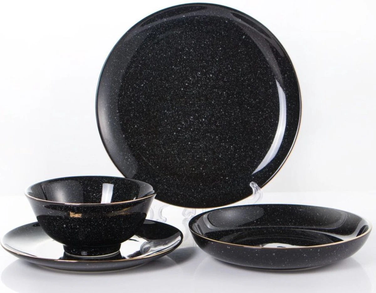 Eet samen met je gezin en gasten in stijl met deze bijzonder en uniek 6 persoons serviesset. Een prachtige complete set in het zwart met witte puntjes en verder nog met gouden randen. Deze set straalt luxe uit en past in veel interieurs.
