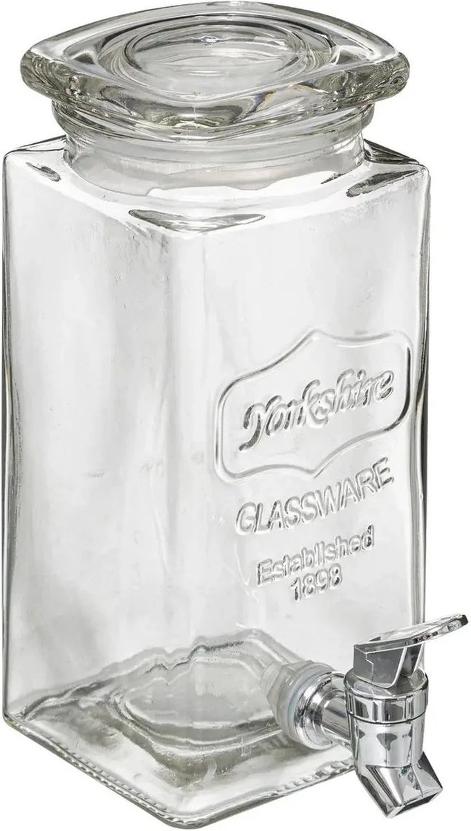 Set van 3x stuks glazen drank dispensers 1,5 liter in een houder met metalen kraantjes en een luchtdichte deksels. Met deze dispensers serveert u op een leuke manier o.a. limonade/water/sappen, ook geschikt voor dranken met vers fruit. Geschikt voor zowel koude als warme dranken, tot 60 graden. Afmeting set: ca. 32,5 x 14 x 36 cm. Afmeting per dispenser: ca. 10 x 10 x 22,5 cm. Inhoud per dispenser: ca. 1,5 liter, 1500 ml. Materiaal: glas/metaal. Reinigen: vaatwasser bestendig.