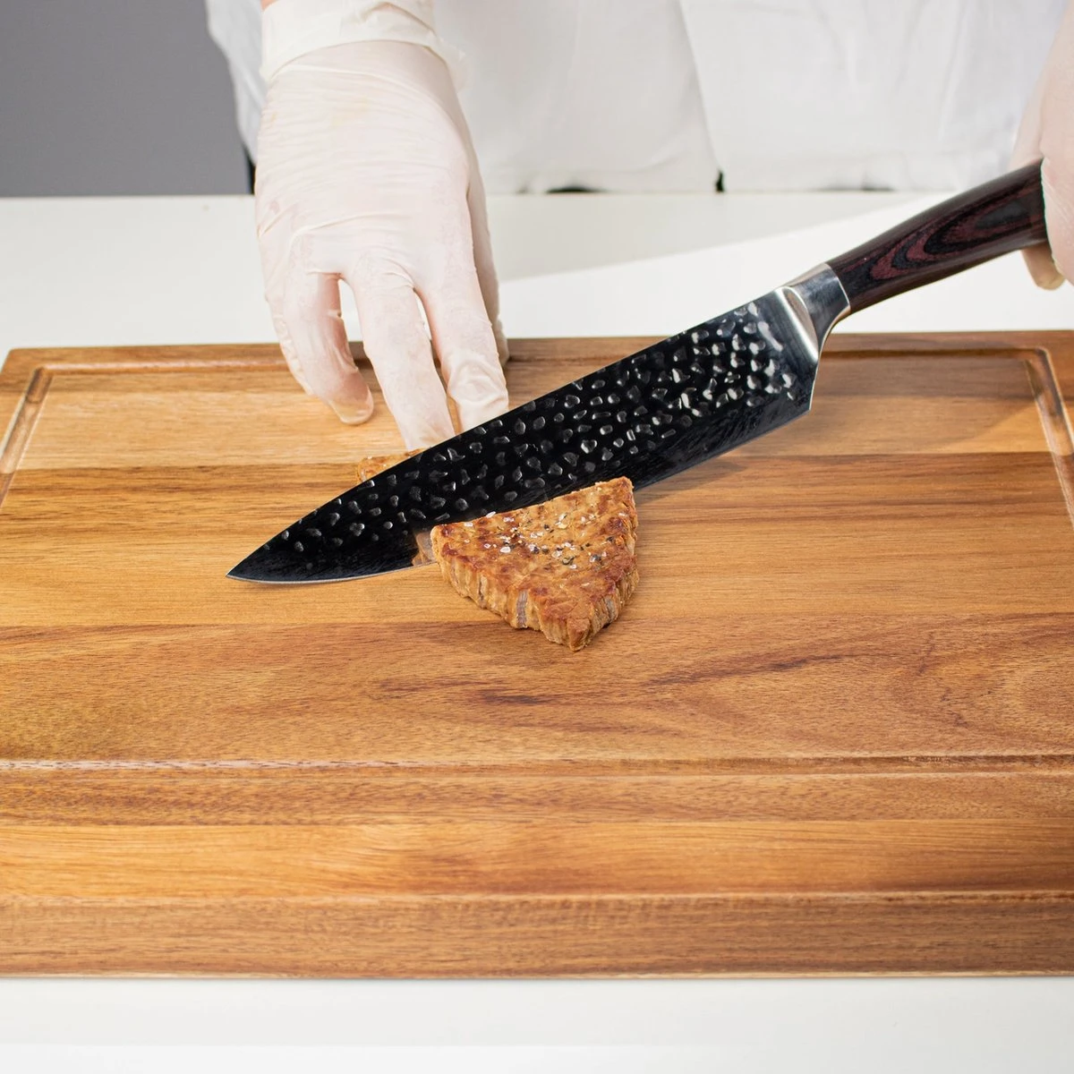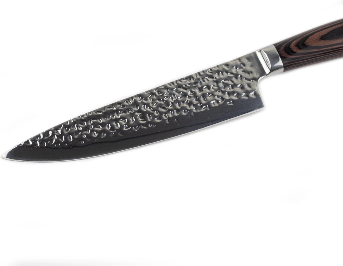 Deze editie van de Hammered RVS Series is tot in alle precisie afgewerkt. Het met de hand gehamerd stalen lemmet loopt door in een prachtige pakkahouten handvat. Het lemmet is op Japanse wijze met de hand gehamerd. Deze techniek heet tsuchime. Dit zorgt niet alleen voor een hoge scherpte en een prachtig uiterlijk, maar voorkomt ook dat je snijwaar aan het lemmet blijft plakken.