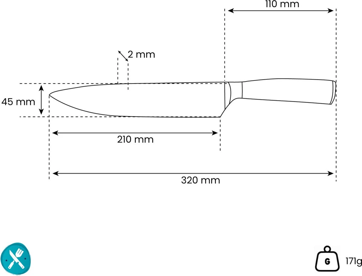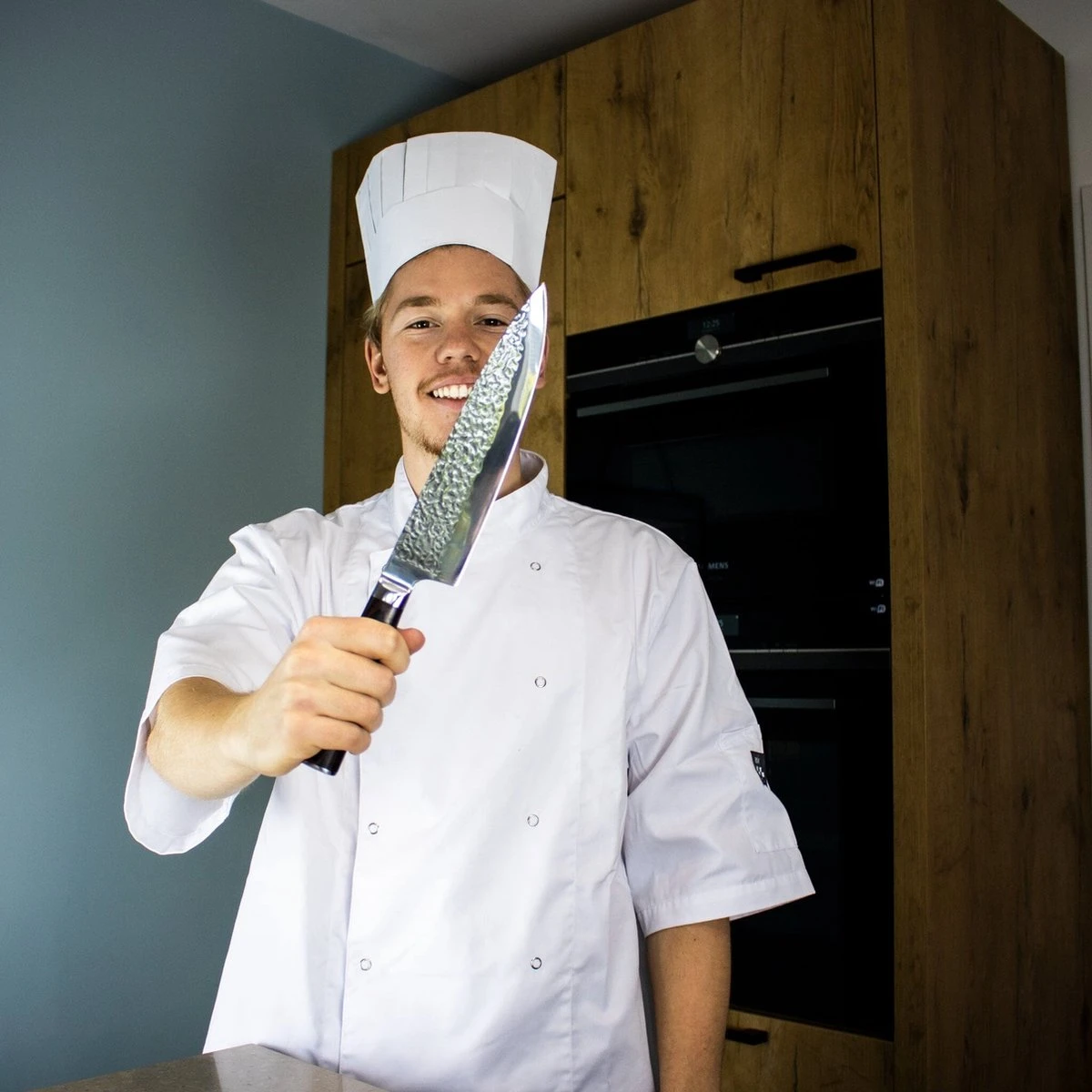 - Vlijmscherp koksmes met een lemmet van 20 centimeter.