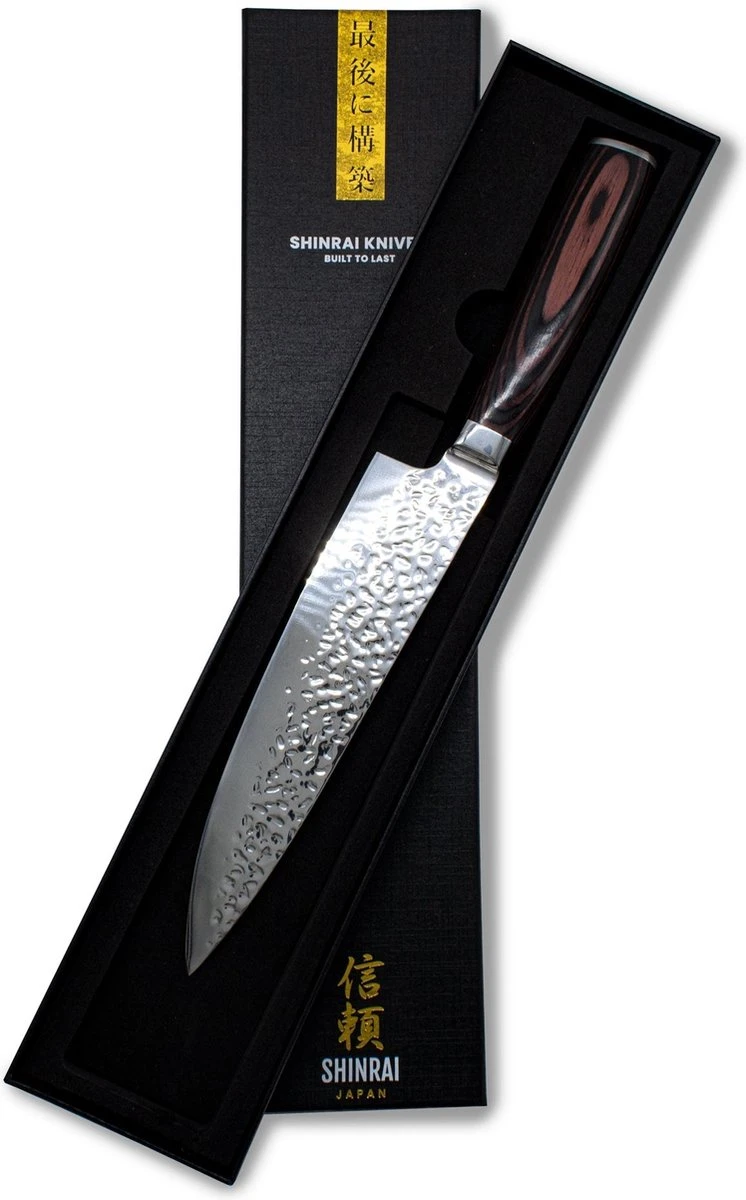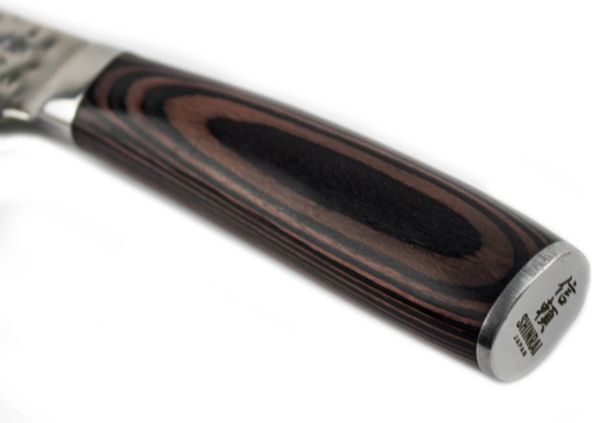 Het met de hand gehamerd stalen lemmet loopt door in een prachtige pakkahouten handvat. Het lemmet is op Japanse wijze met de hand gehamerd. De handgreep ligt erg prettig in de hand, zowel voor links- als rechtshandigen. Een prachtig detail is het logo van Shinrai Japan op het uiteinde van de handgreep. Een beeldschoon mes met de perfecte grip.