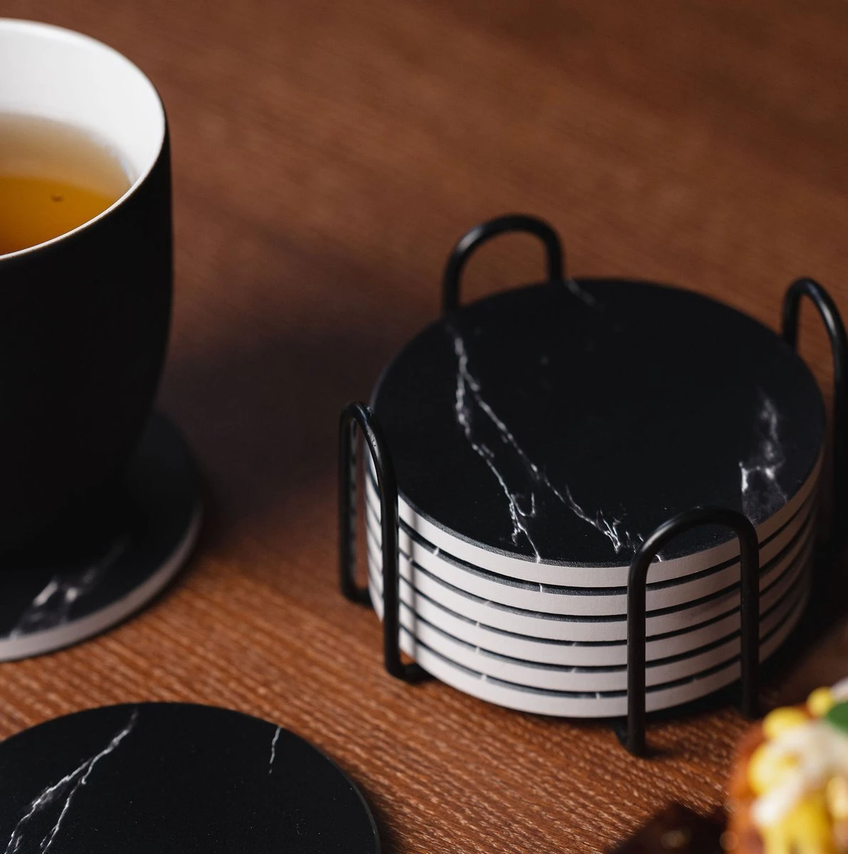 De onderzetters hebben een dikte van 8 mm: 7 mm keramiek en 1 mm kurk en een diameter van 10,3 cm. Dit zorgt ervoor dat de onderzetters een robuust ontwerp hebben en jaren meekunnen met de meegeleverde metalen houder. Keramiek staat bekend om haar gladde, moderne uitstraling. De zwarte, keramische structuur van de onderzetters voegt hier meer luxe aan toe!