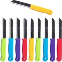 Onze specialiteit! Een wat groter mes dan onze schilmessen, deze kartelmes met een extra lang lemmet en scherpe kartels om de taaie huid van tomaten en paprika’s door te snijden, maar zeker ook geschikt voor zacht fruit. Deze tomatenmesjes / kartelmes hebben een kunststof handvat en een roestvrij stalen blad met fijne kartels.