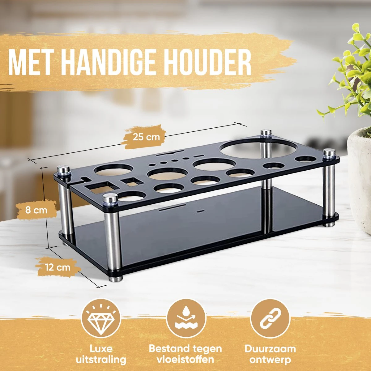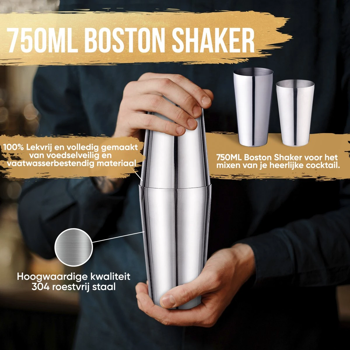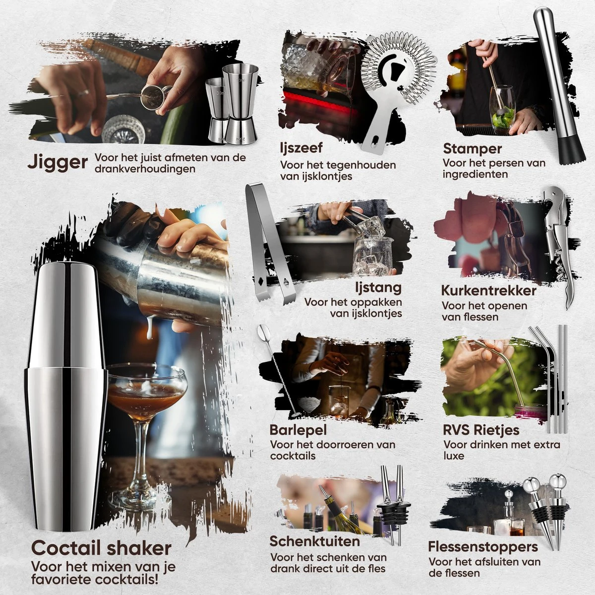 De volledige set bestaat uit 21 producten. Om precies te zijn 20 onderdelen en één gedrukt receptenboek (Nederlandstalig). De cocktail set is gemaakt van roestvrij staal. De handige houder waar je alle accessoires in plaatst is gemaakt van acryl.