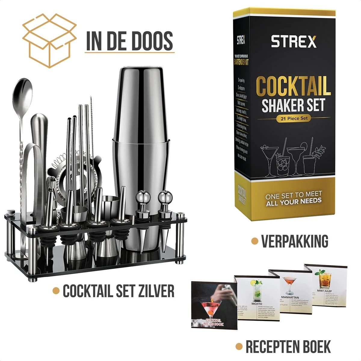 Genieten van de lekkerste cocktails? Vanaf nu hoef je daarvoor niet meer de deur uit. Haal de professionele 21-delige cocktail set van Strex in huis en maak binnen no-time de allerlekkerste cocktails! Ideaal voor een gezellig avondje met je partner, vrienden of vriendinnen of tijdens een andere gelegenheid. De cocktail shaker wordt geleverd met alle accessoires die je nodig hebt om de mooiste en lekkerste cocktails te creëren.