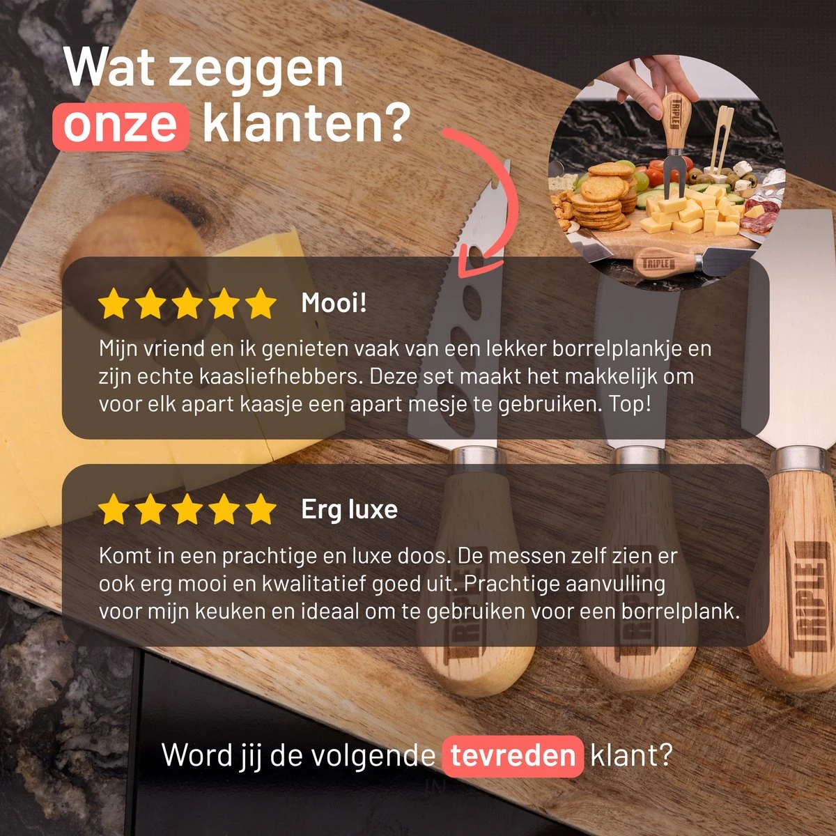 Maak er met de Triple J® Kaasmessen set een smakelijke borrel van. Met de kaasmesjes zul je voortaan nog beter de unieke smaak van elke kaas kunnen proeven!