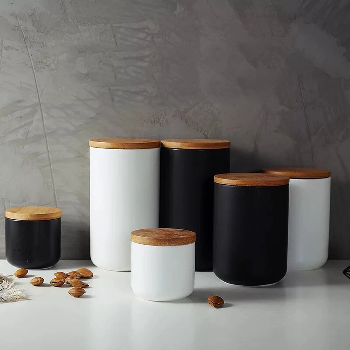 Voorraadpotten Keramiek – Suikerpot 3 stuks – Deksel Bamboe – Luchtdict Voorraadbussen Potten – Zwart