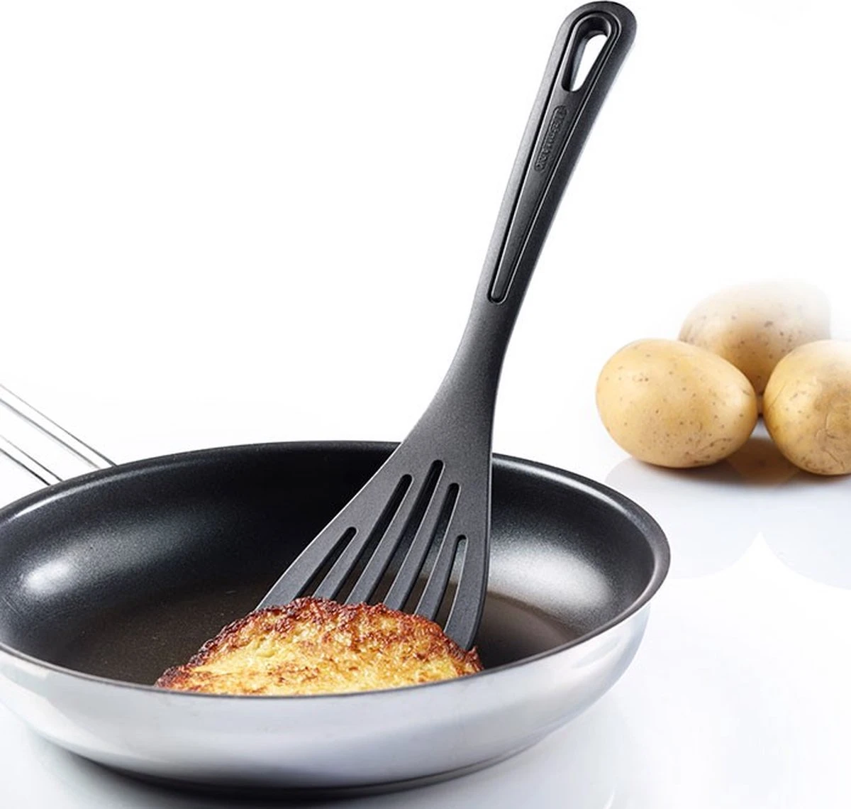 Deze spatel is ideaal voor gecoate potten en pannen. Daarnaast is hij gemaakt van polyamide van hoge kwaliteit. De spatel is hittebestendig tot 210 graden Celsius. De spatel is gemakkelijk te reinigen in de vaatwasser.