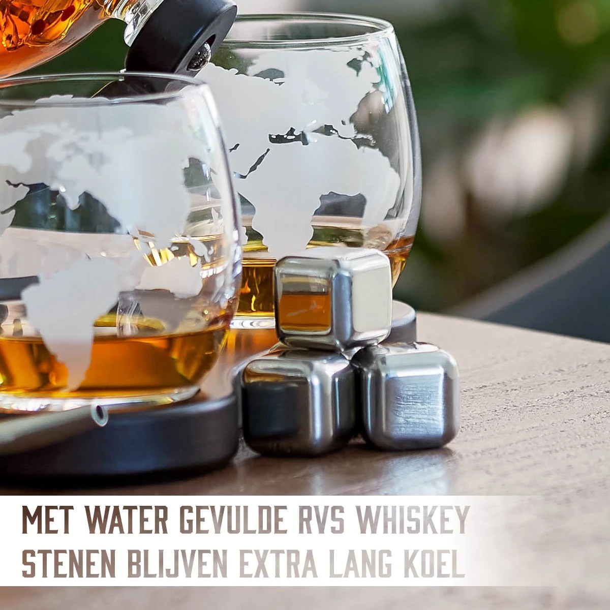 De meegeleverde accessoires maken de whiskey beleving helemaal compleet. Schenk de whiskey karaf vol zonder dure whiskey te morsen doormiddel van de schenktuit. Plaats vervolgens de ijskoude roestvrijstalen stenen veilig in de 4 bijpassende wereldbol whiskey glazen met de ijstang. Deze rvs whiskey stenen hebben als grote voordeel dat ze niet smelten en dus je whiskey niet verdunnen! Hierdoor blijft je whiskey puur van smaak. Schenk tot slot de whiskey in het glas en genieten maar!