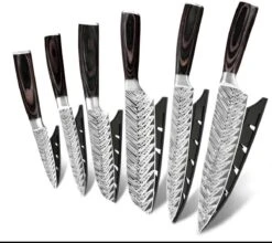 Opzoek naar een professionele messenset? VOLLEDIGE Japanse keukenmessen set met glad afgewerkte zwarte handgrepen. Messen gemaakt van exotisch staal. Een must-have voor elke chef! Bevat een schilmesje, een hobbymes, een santokumes, een snijmes, een broodmes en een koksmes.Of het nu gaat om snijden van een mooi stuk vlees, het fijn snijden of hakken van verse groenten en kruiden of het kneuzen van specerijen. Voor elk snijwerk is net een ander mes nodig of handig. Voor elke situatie een scherp mes.