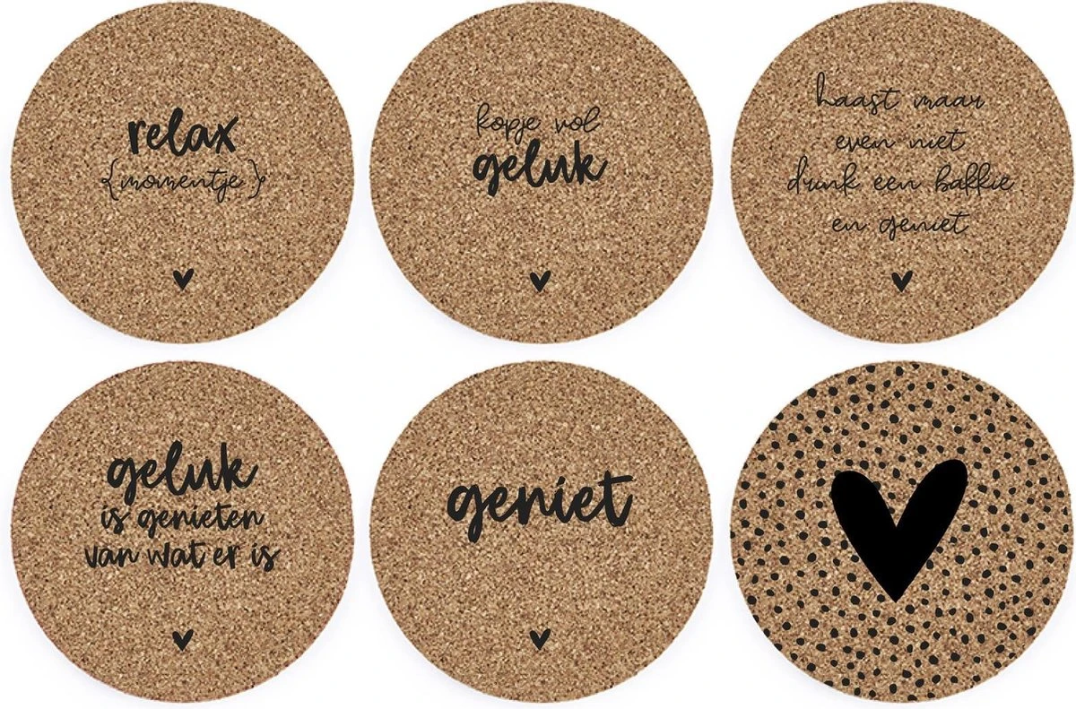 Mooie onderzetters van kurk bedrukt met verschillende teksten. De ronde onderzetters hebben een doorsnede van 7,5cm en zijn een halve centimeter dik.
